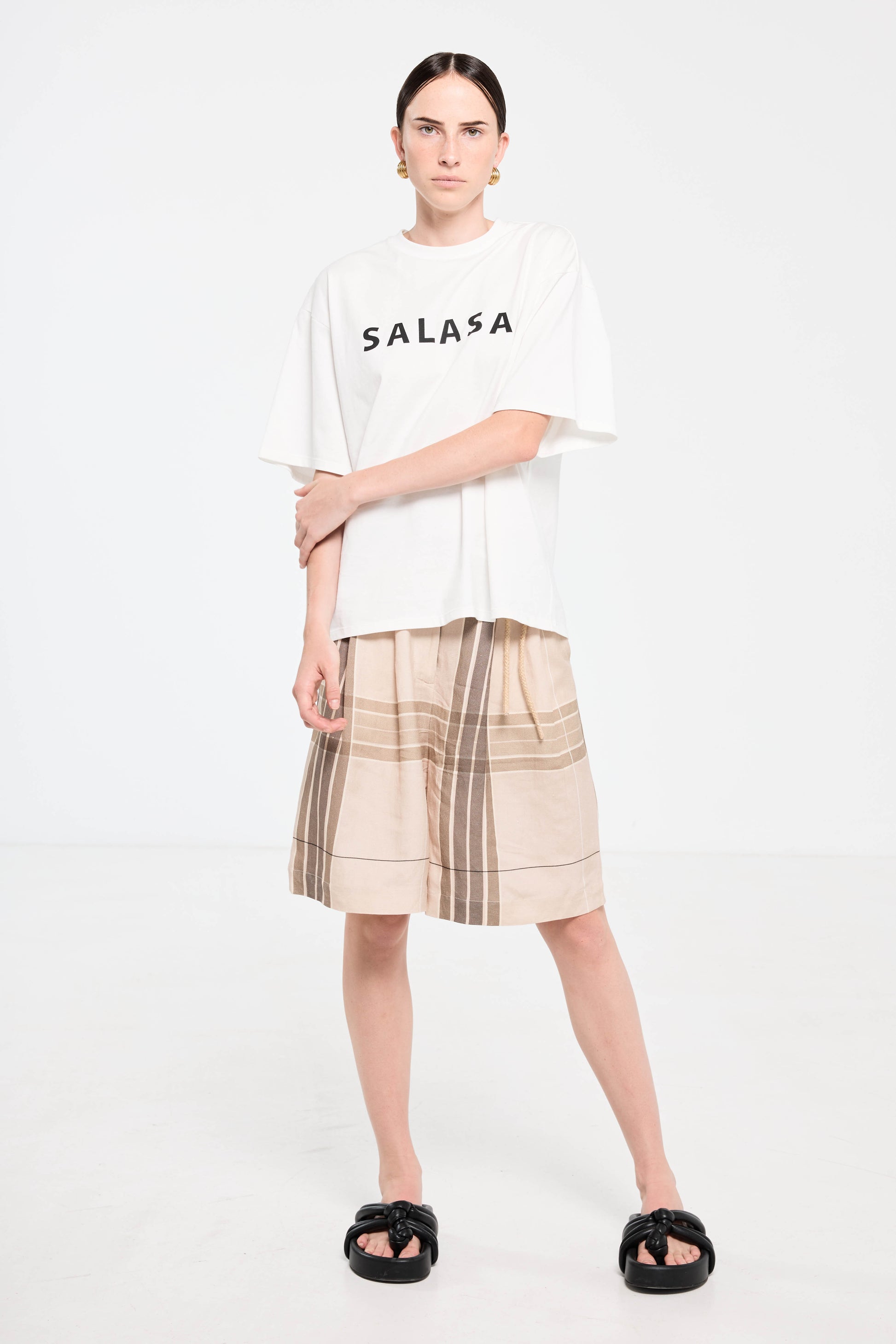 The Salasai Tee in White is one of our classic Basic Tee’s.The tee features include round neckline, Black water based screen print SALASAI and the fit is boxy but a women's cut, this isn't a unisex tee but more so a loose womens cut tee shape.