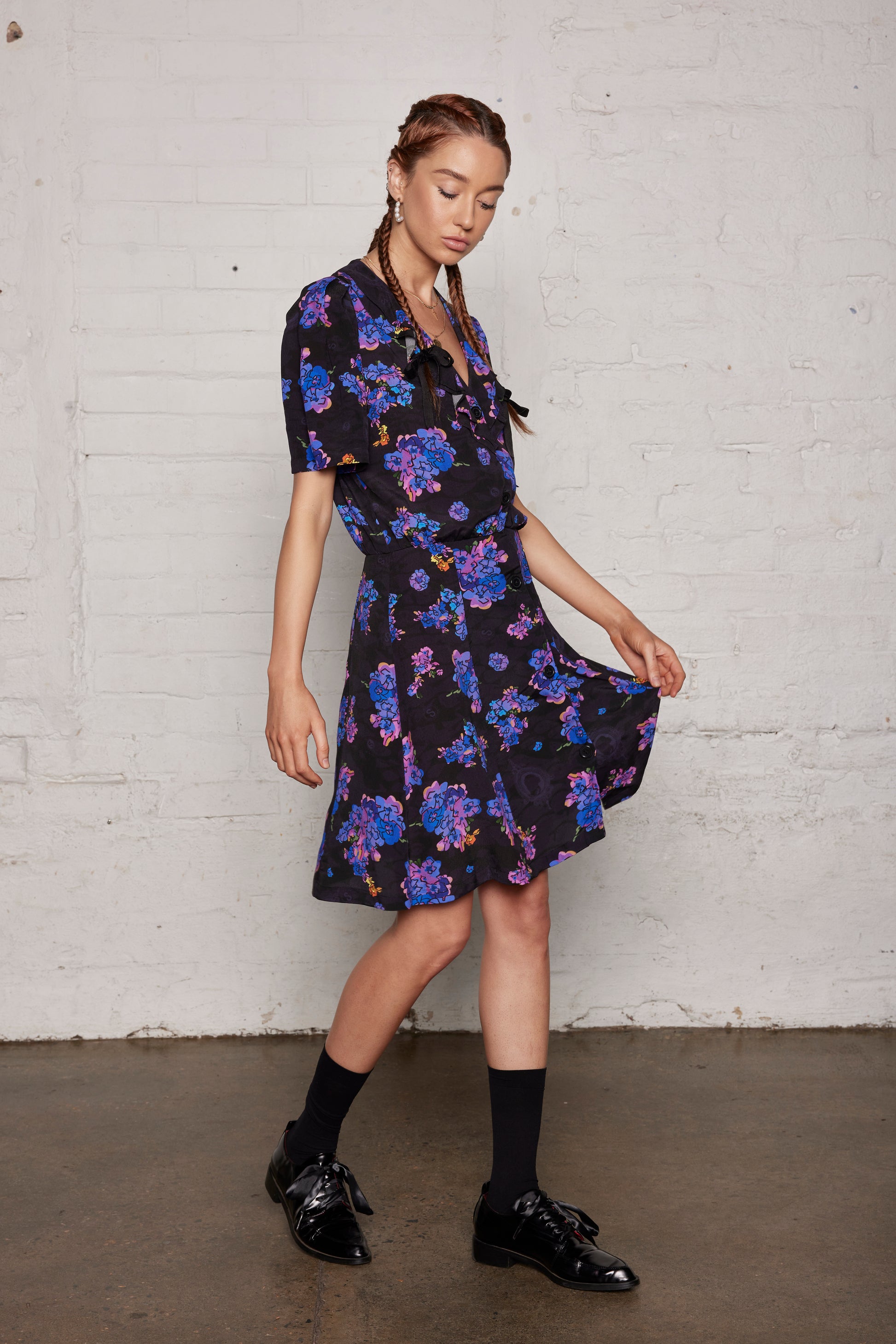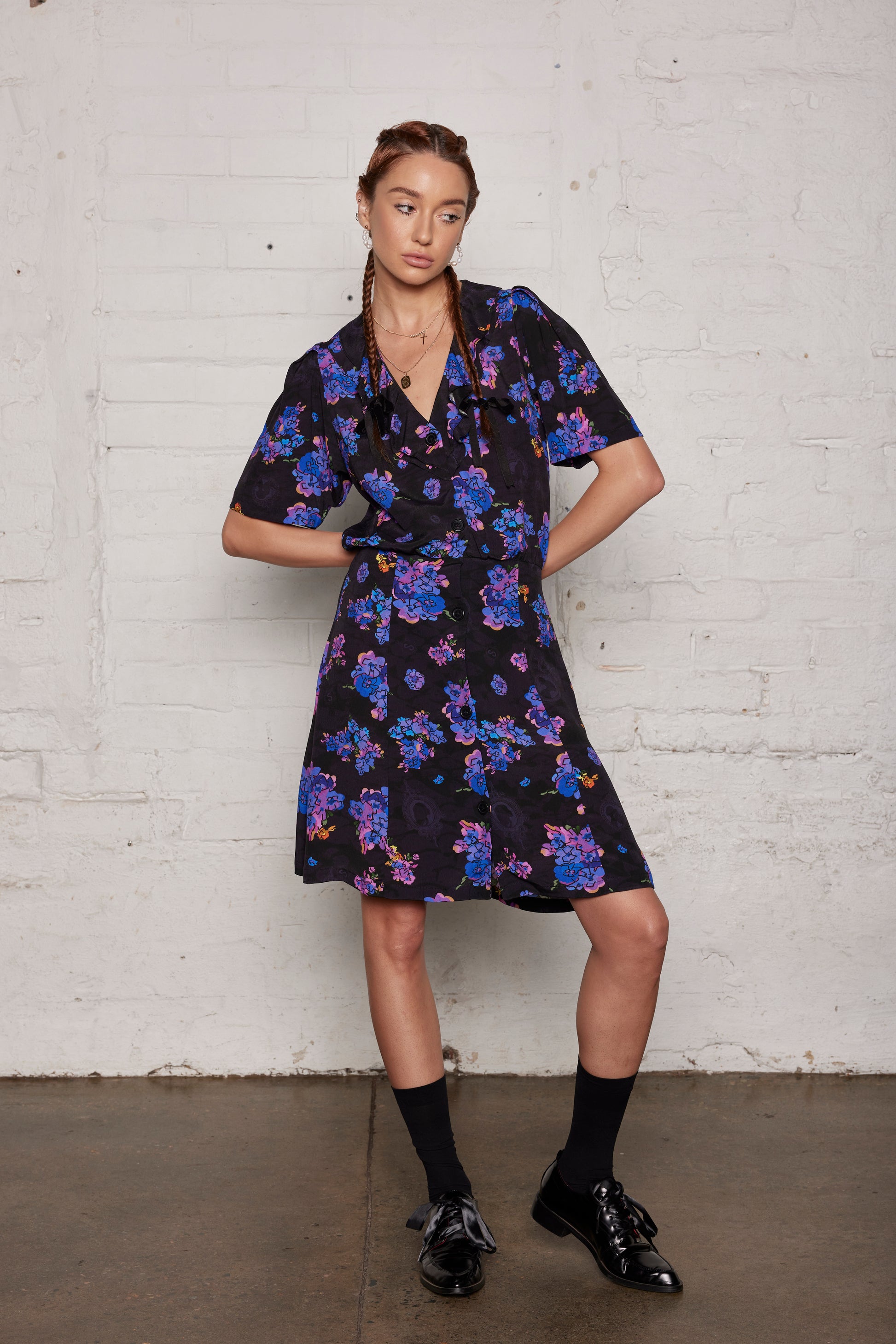 Introducing our hierloom dress in the violet bouquet print —a delightful blend of feminine charm and trendy sophistication. This dress exudes elegance with its captivating floral print, puffy sleeves, and cinched waist, accentuating your style effortlessly
