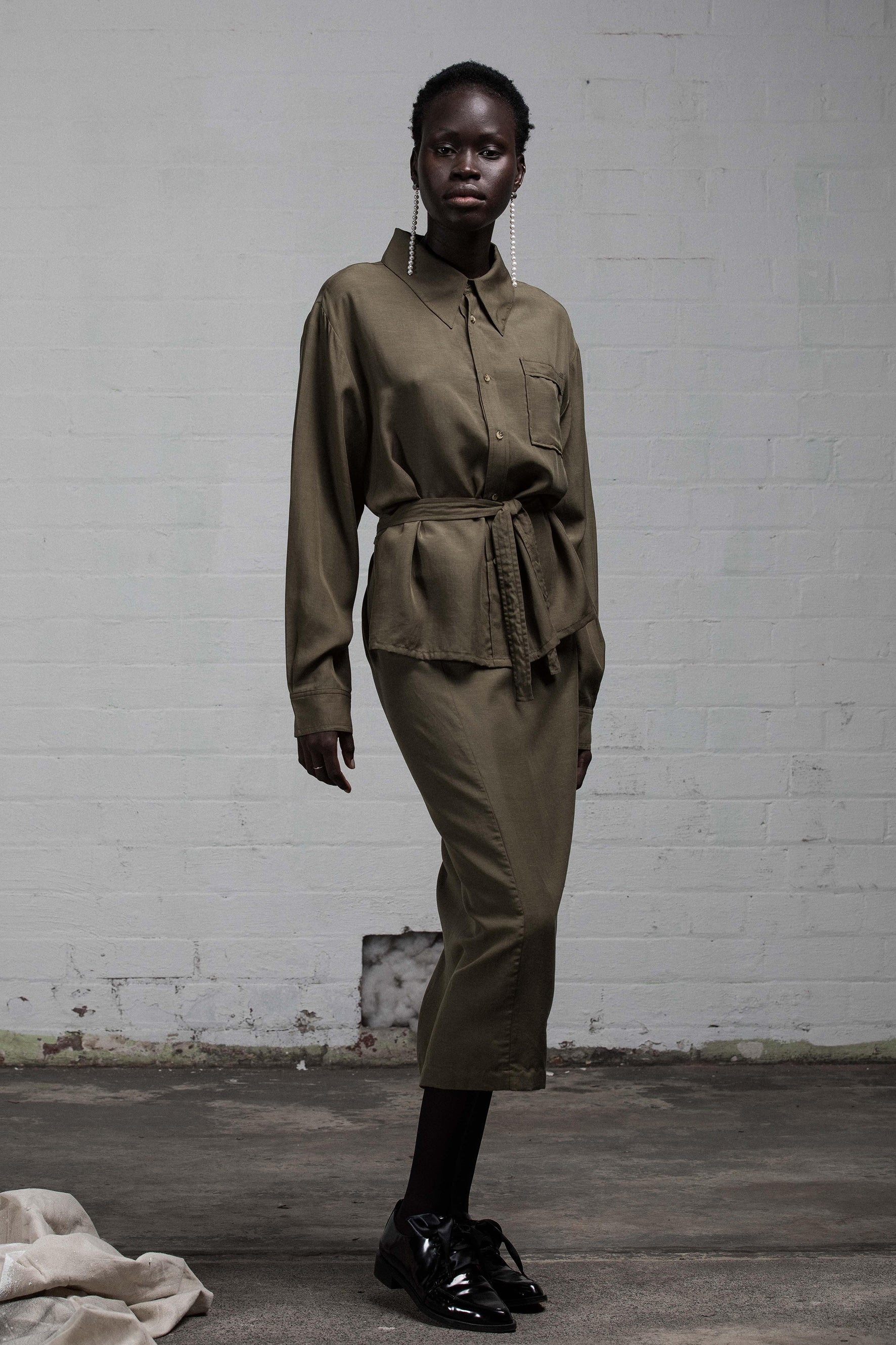 The dress is like having two garments in one were the skirt piece wraps the body making it very adjustable in size and ties to the back or front, then attached at the back only is the upper back part of the blouse with a boxy fit while the upper part front has open collar and wide sleeves with chest patch pocket.