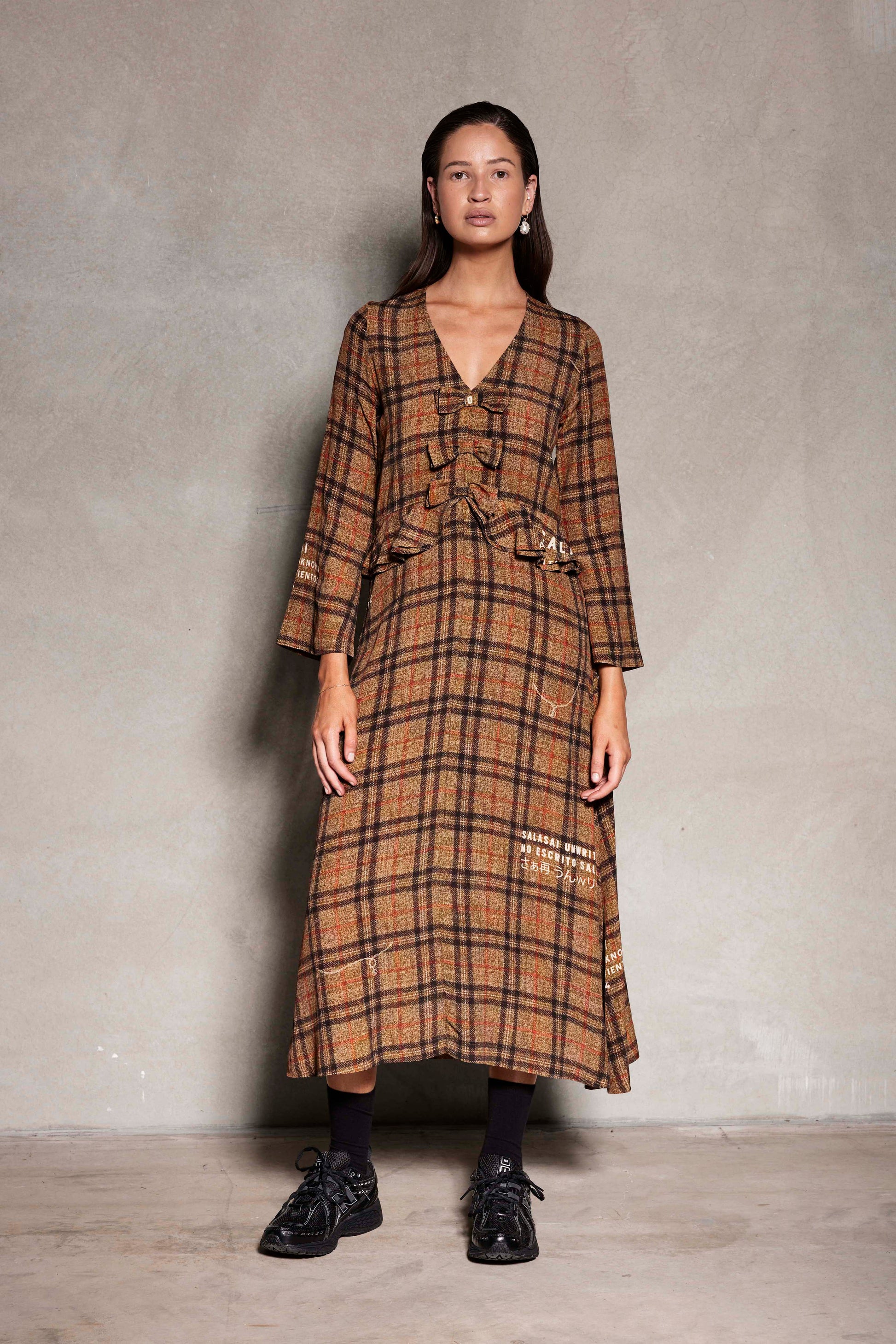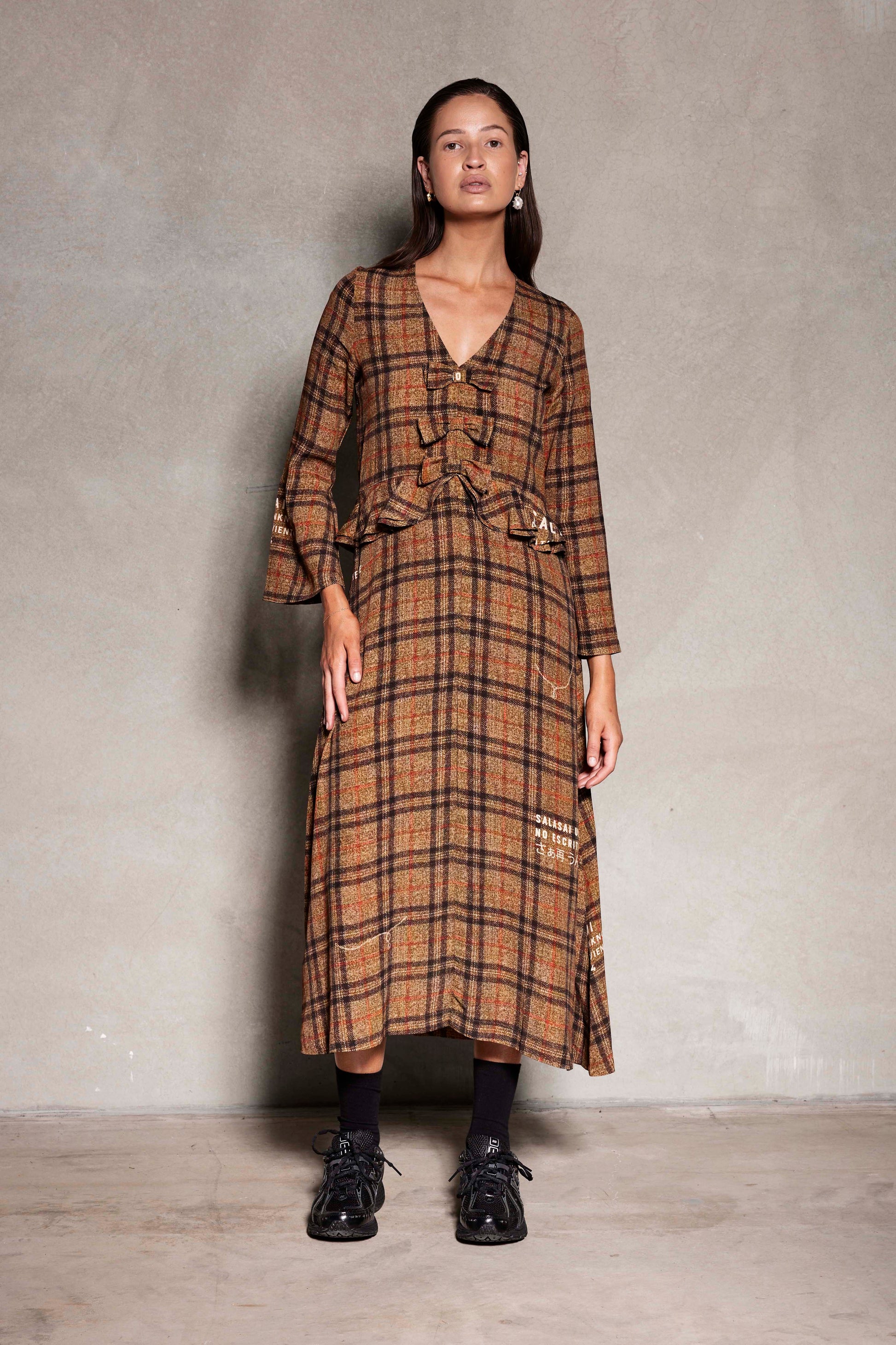 What sets this dress apart is the unique bowtie detailing that adds a whimsical and charming element to the garment. The frilled waist further enhances the dress, providing a flattering and feminine silhouette.