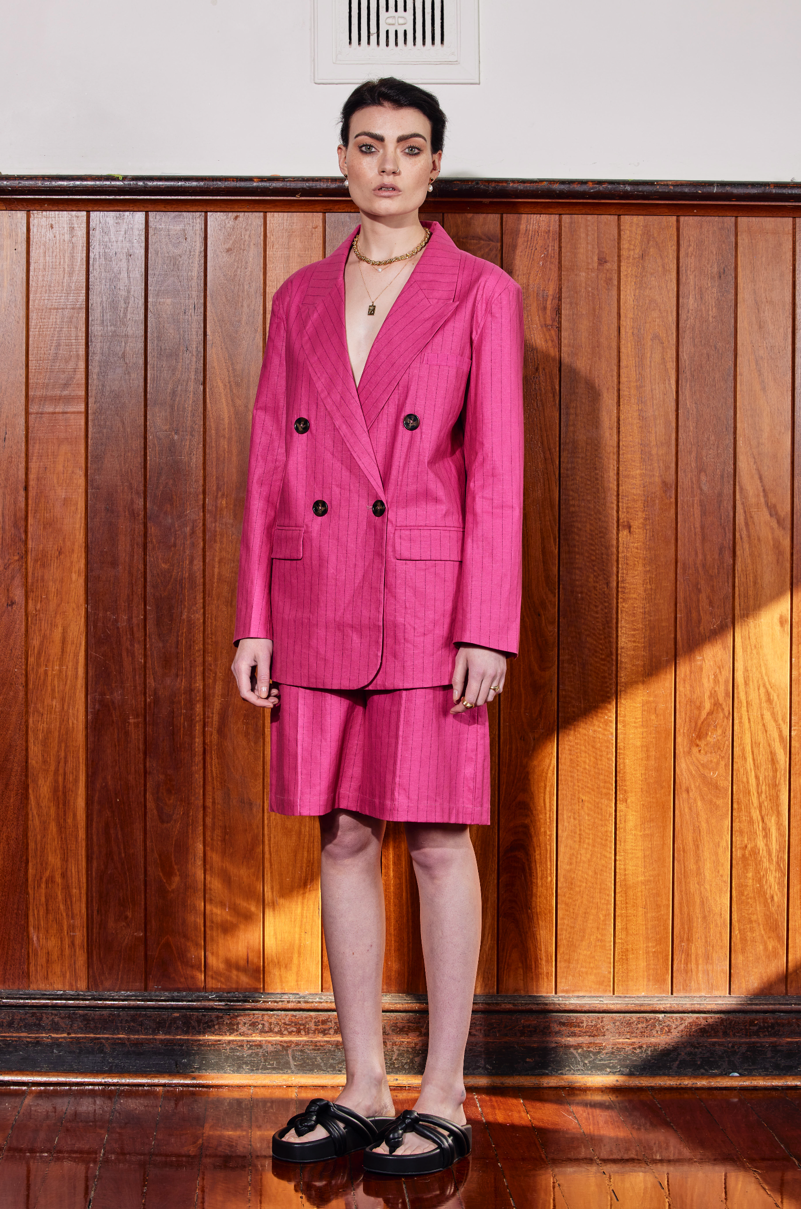 Bright and vibrant pink pinstripe, other features include elasticated waistband and a back jet pockets.