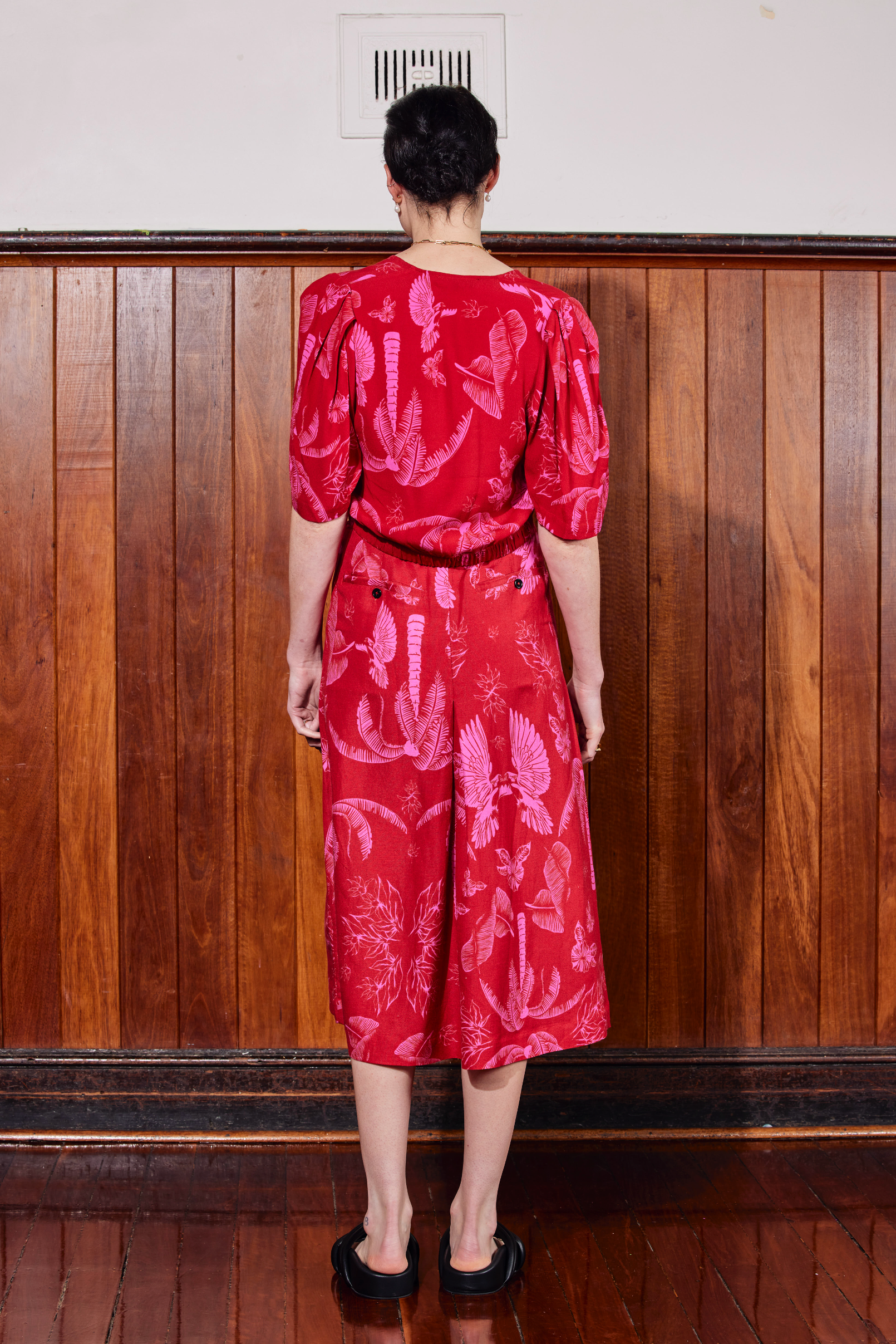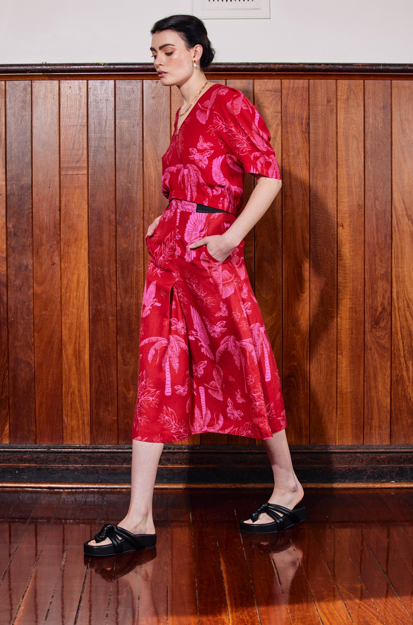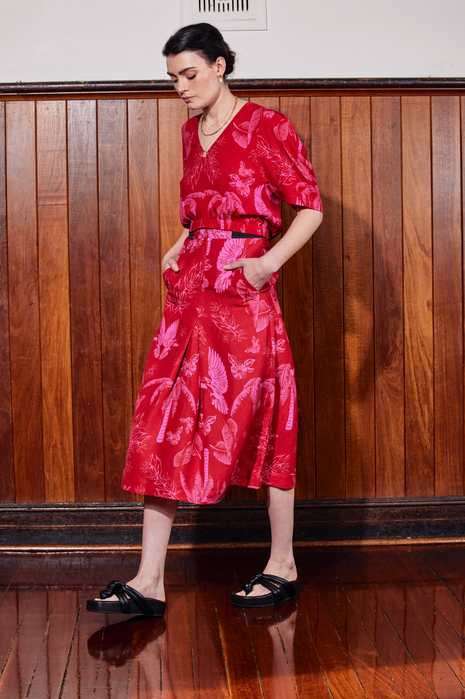 The Wild Tropics Skirt is a beautifully crafted statement skirt in vibrant pink and red.