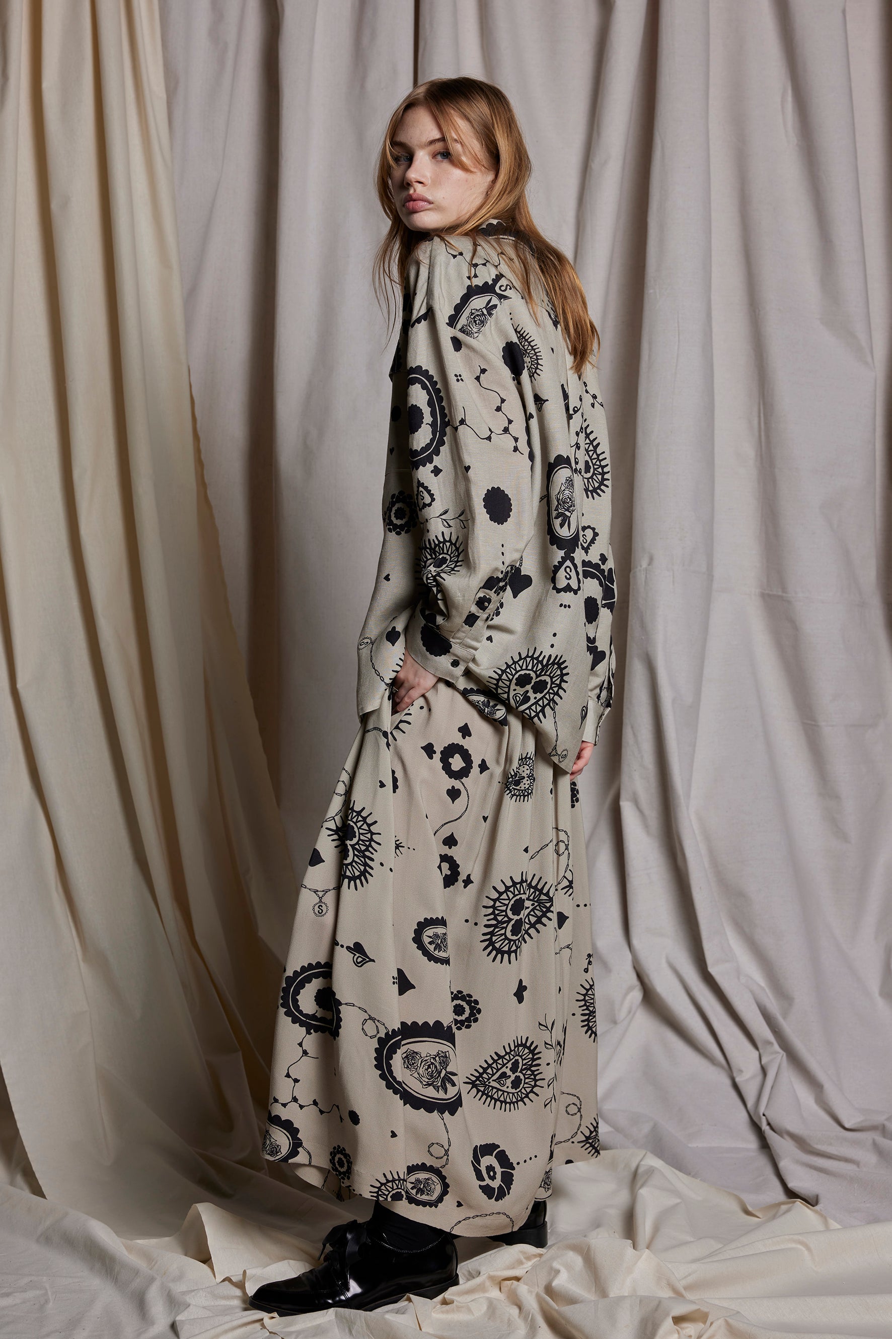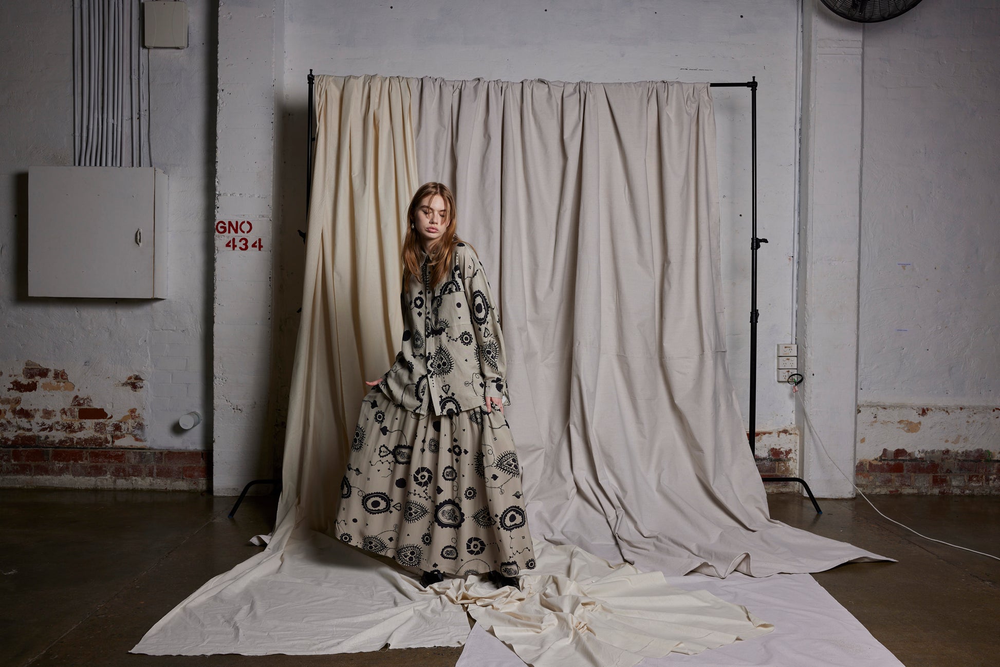 Featured here in the Salasai Stone Cameo print are moments of sweetness & surrender featuring cameo embroideries. The hand drawn doily print explores the sense of vintage nostalgia.