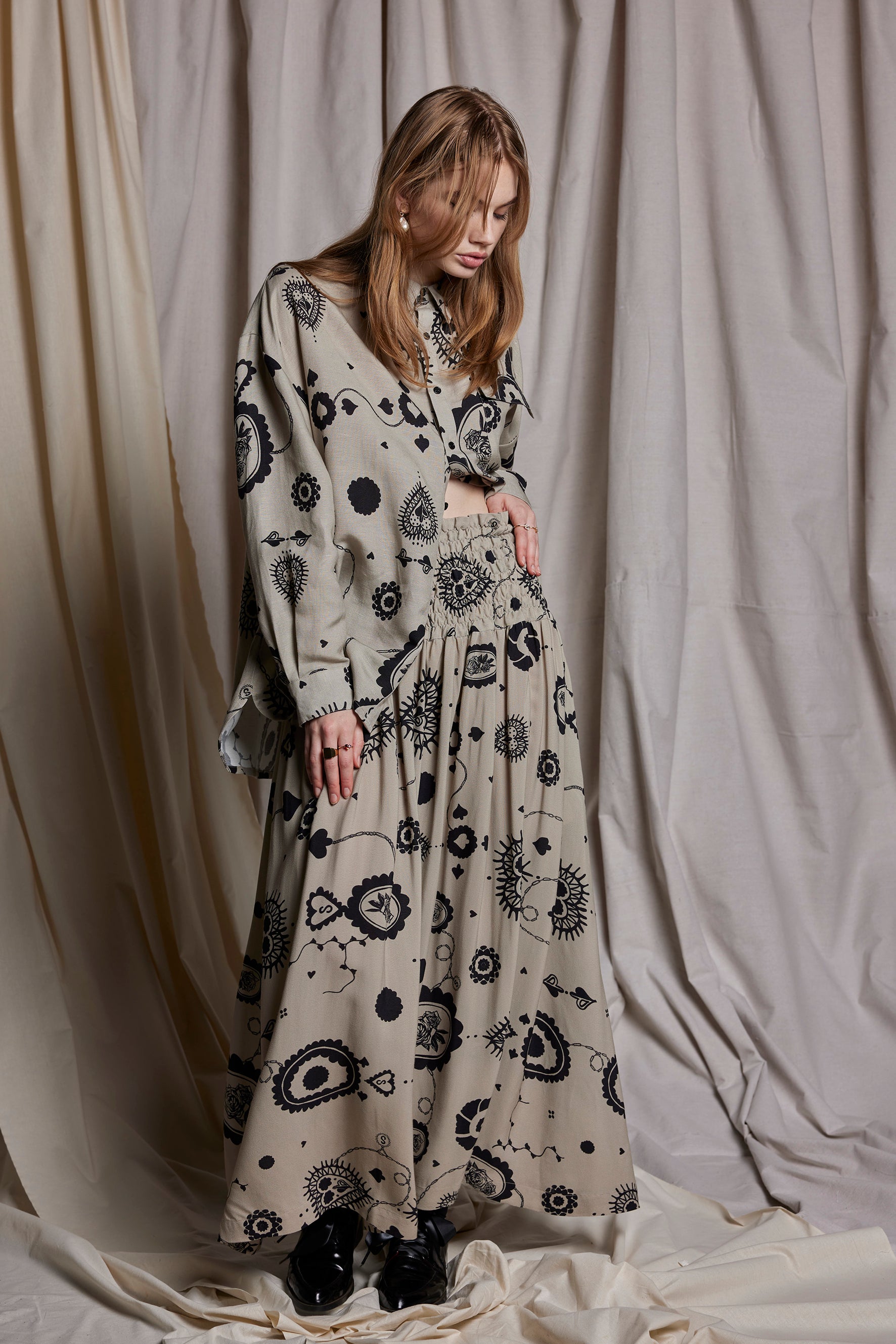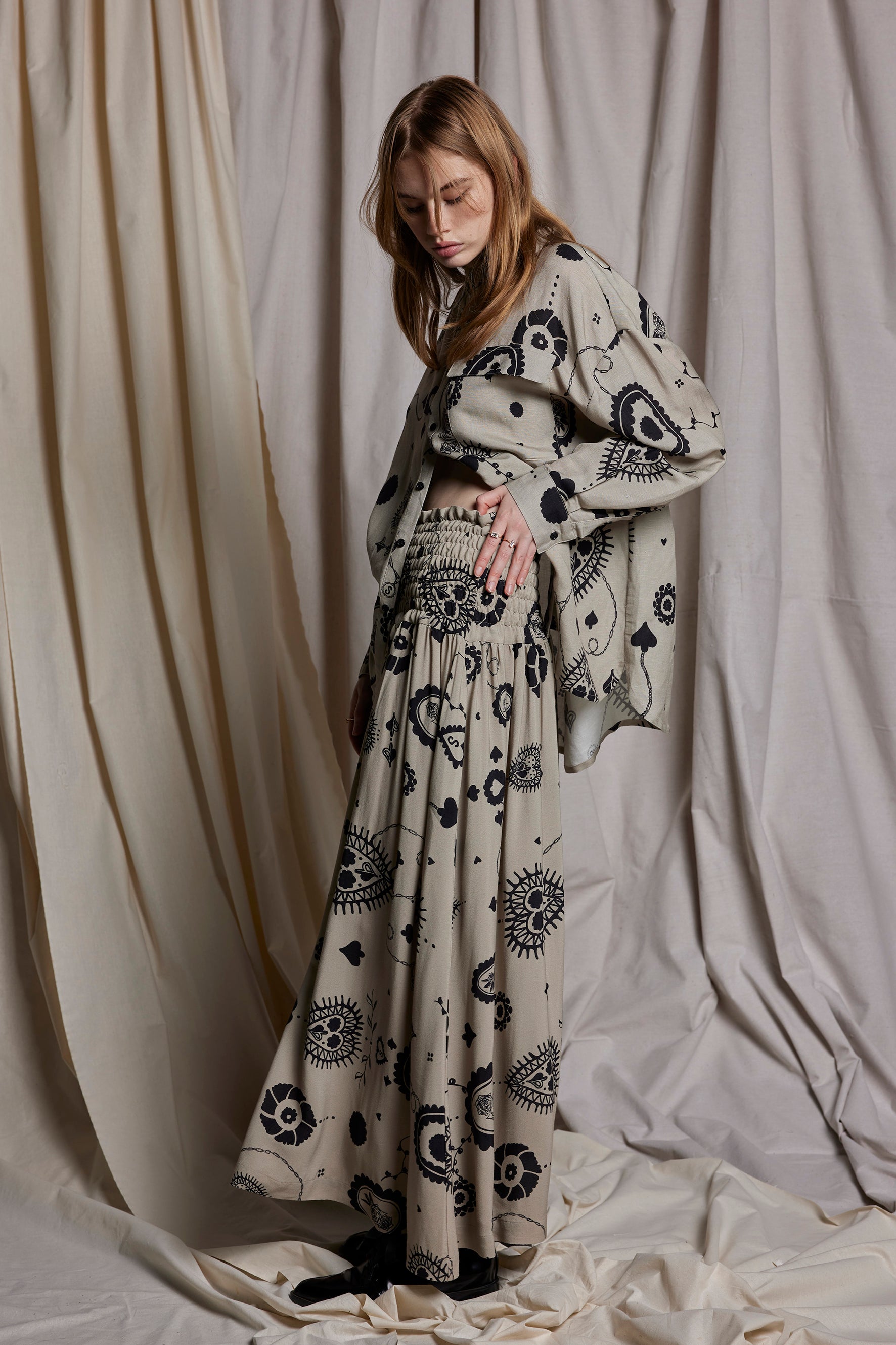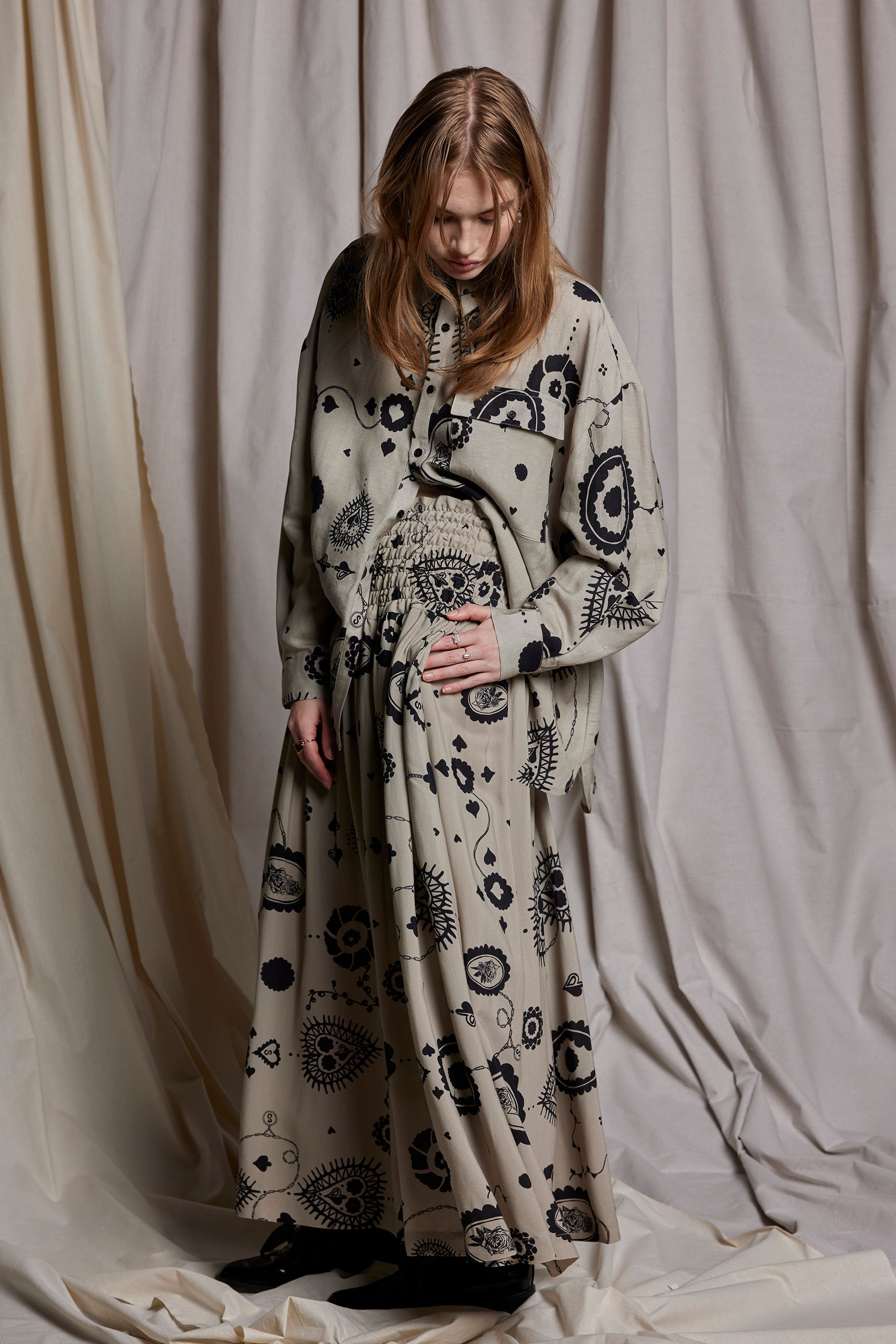 Featured here in the Salasai Stone Cameo print are moments of sweetness & surrender featuring cameo embroideries. The hand drawn doily print explores the sense of vintage nostalgia.
