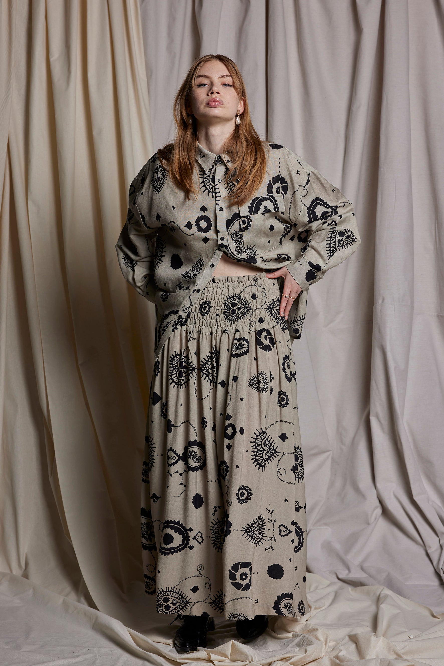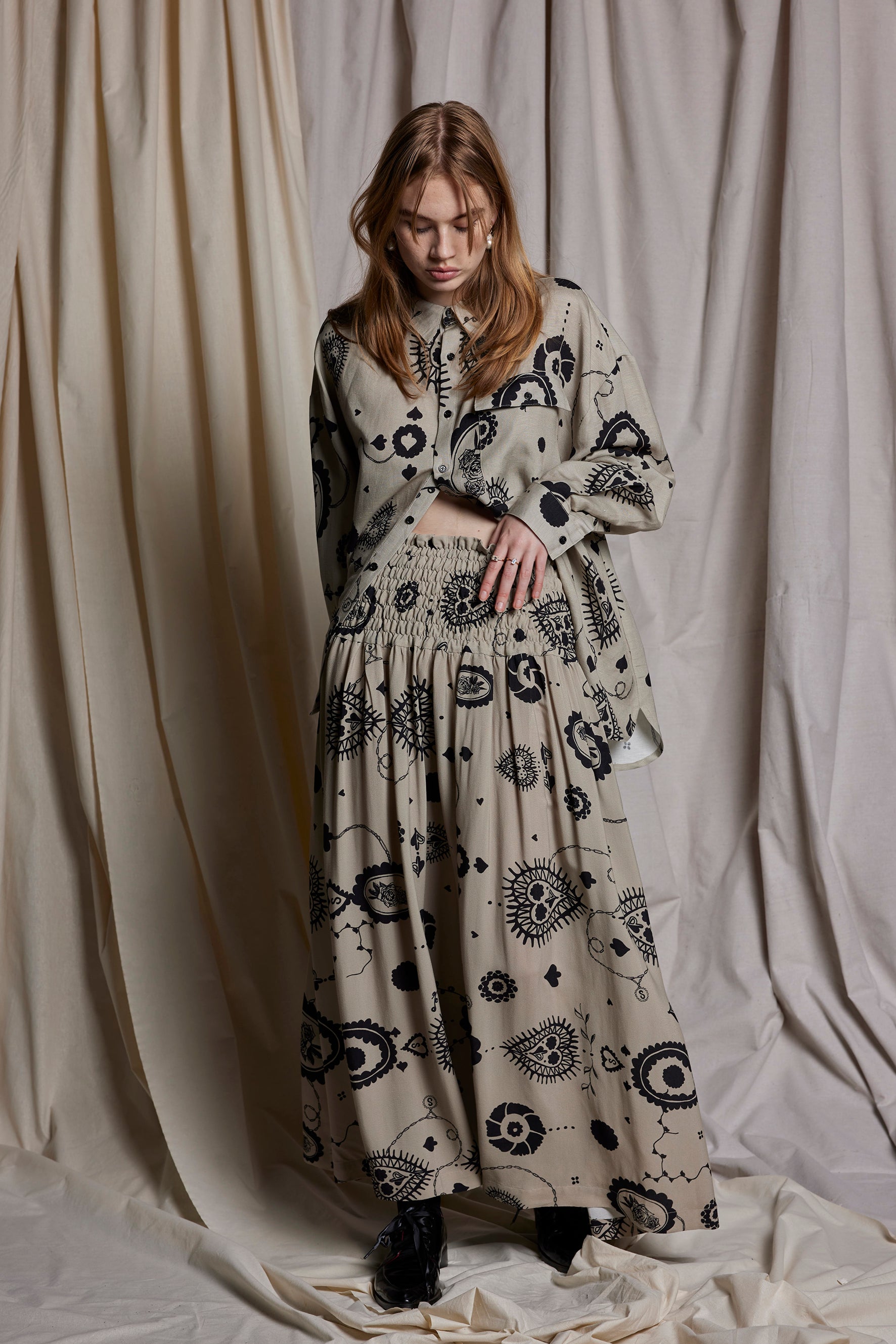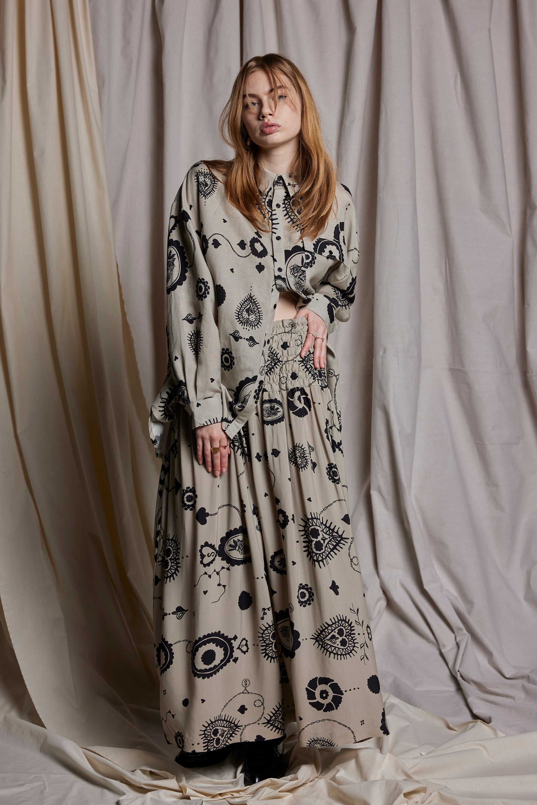Featured here in the Salasai Stone Cameo print are moments of sweetness & surrender featuring cameo embroideries. The hand drawn doily print explores the sense of vintage nostalgia.