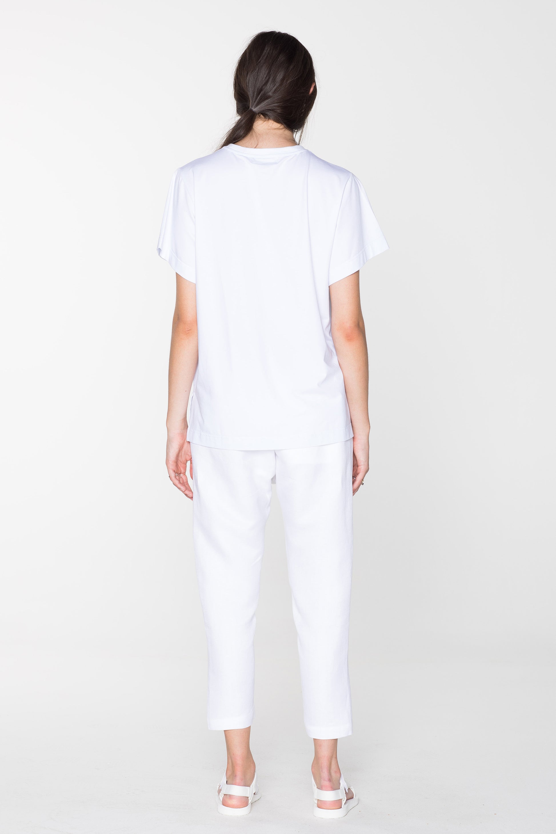 A classic round neck mercerised cotton tee that drapes beautifully around the body and features a side seam split to allow extra comfort and detail.