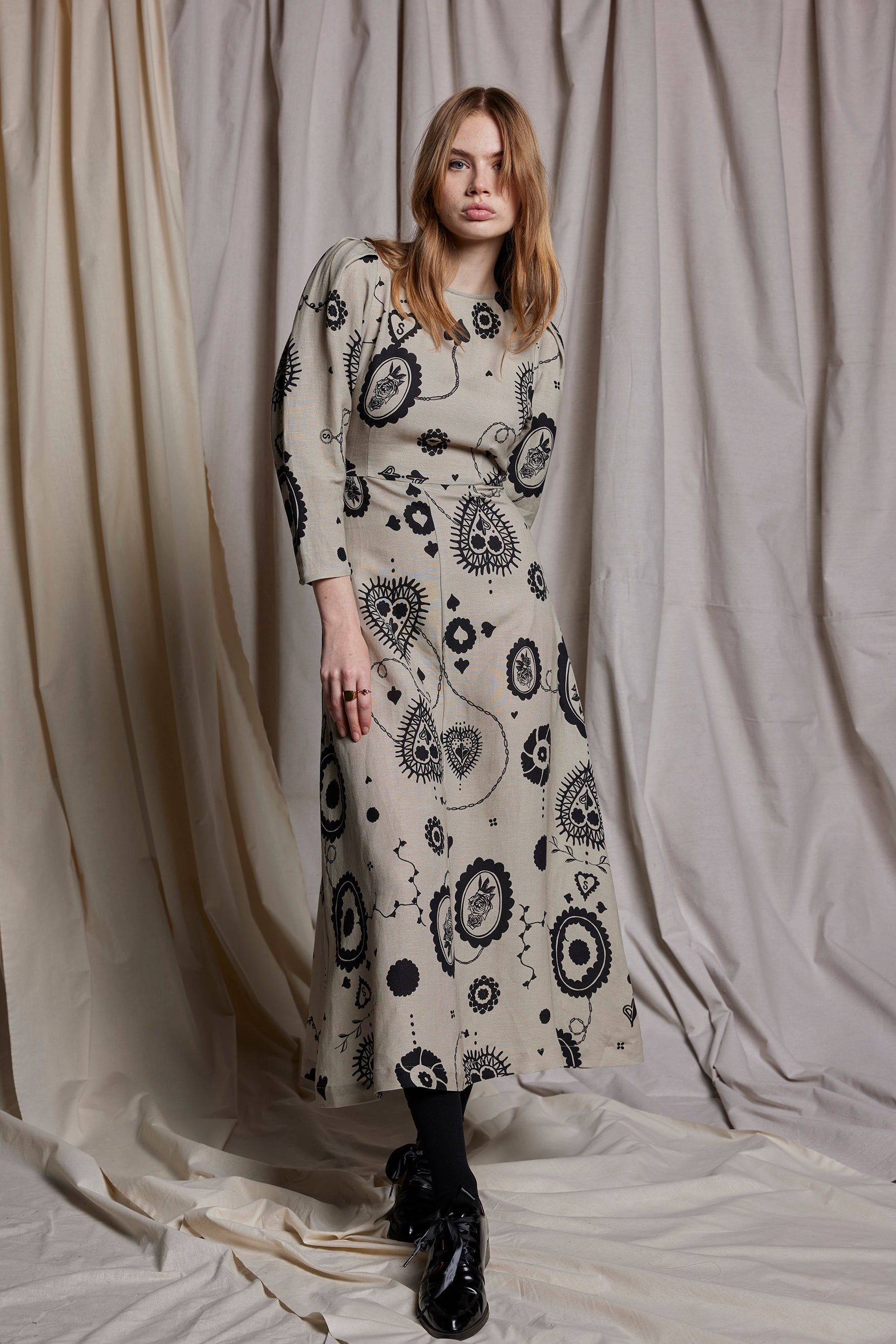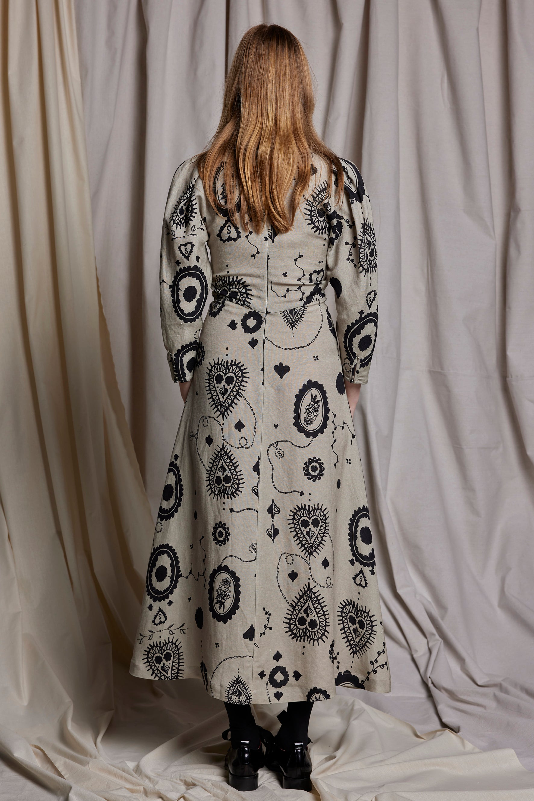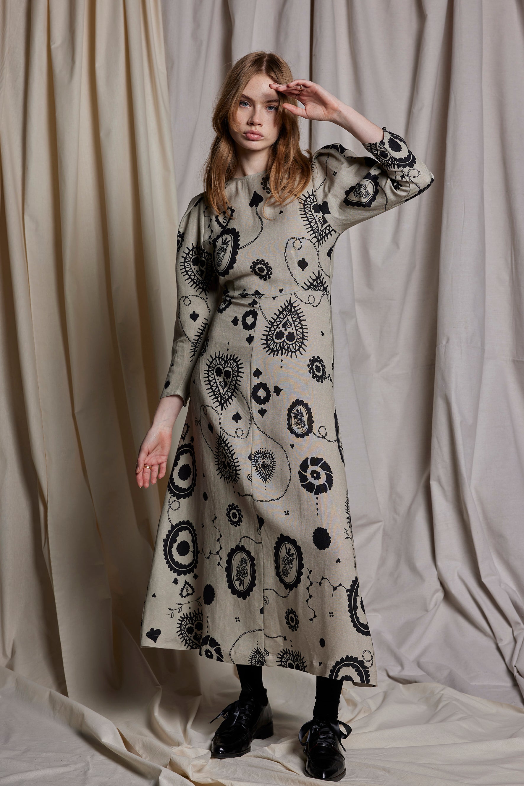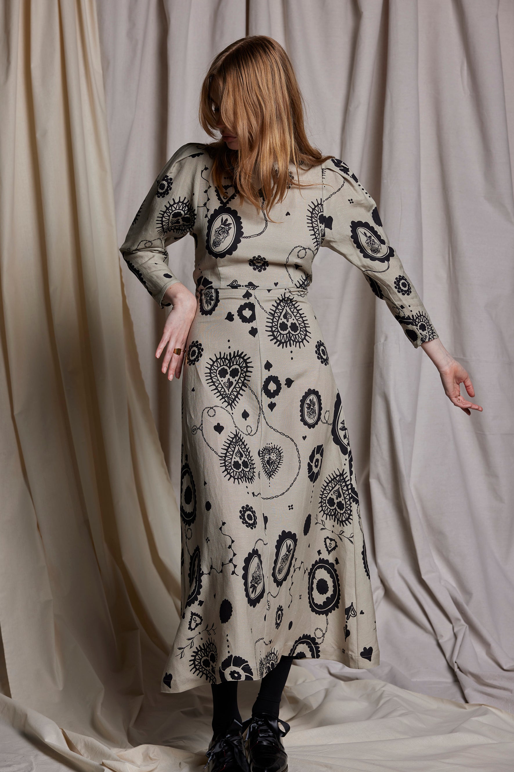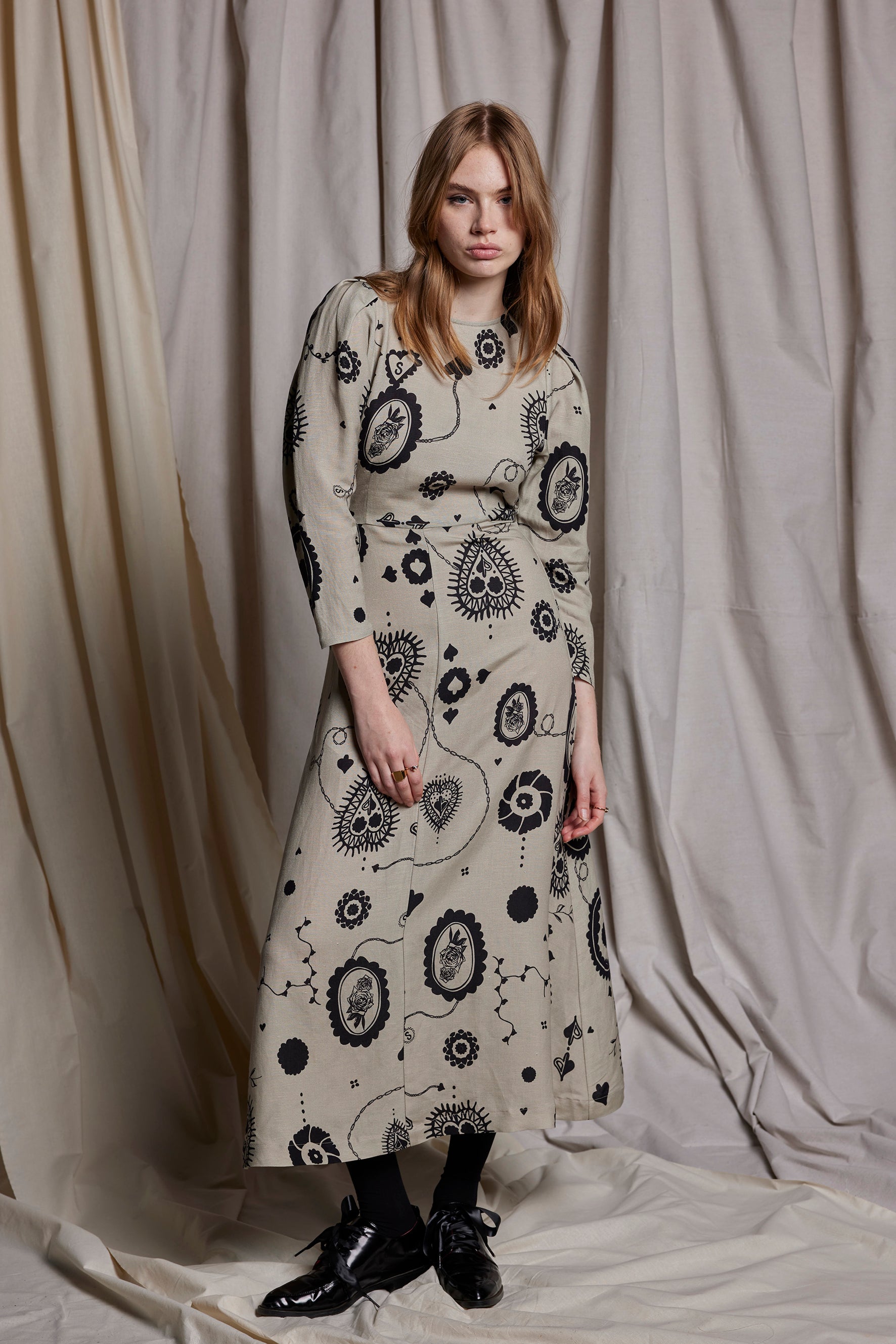 Featured here in the Salasai Stone Cameo print are moments of sweetness & surrender featuring cameo embroideries. The hand drawn doily print explores the sense of vintage nostalgia.