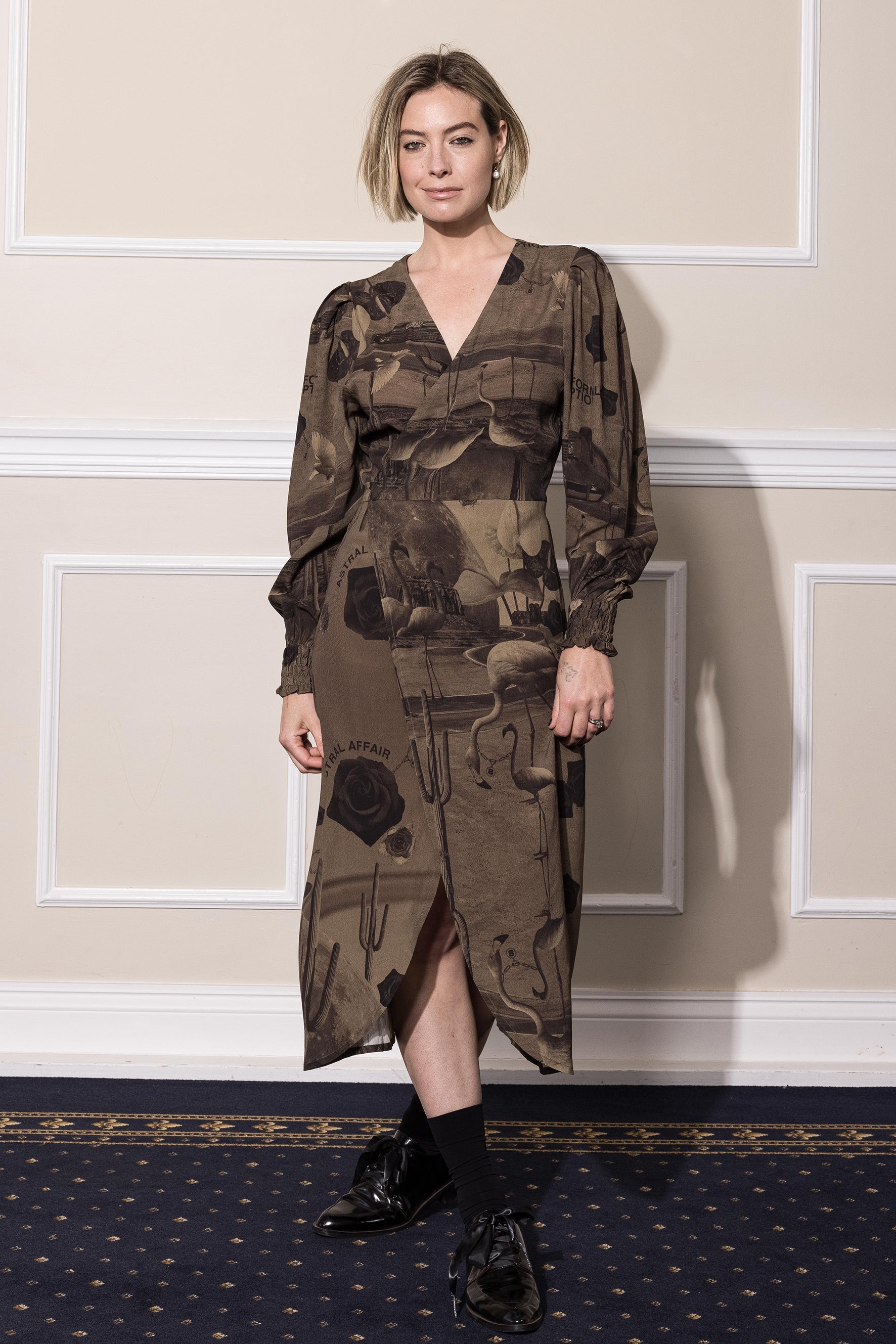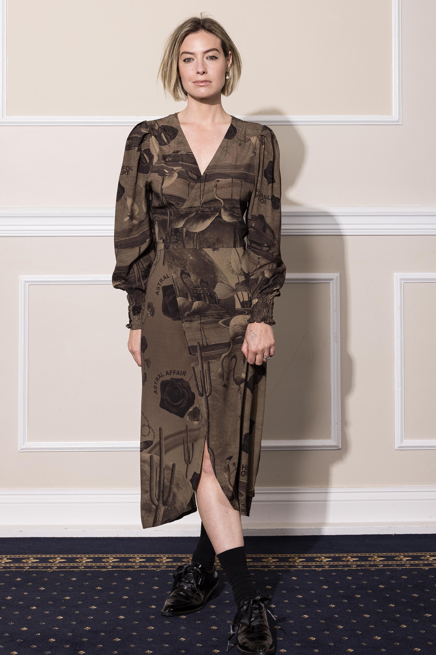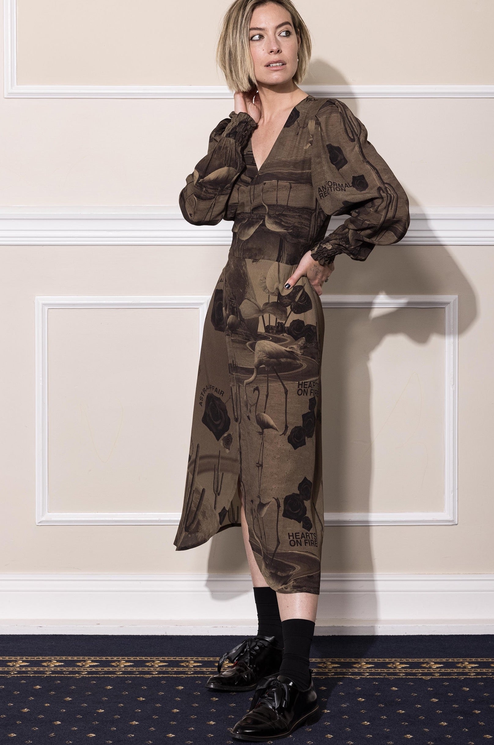 An alternate world, ‘NEON DESSERT’ professes a yearning for a futuristic affair. An obscure romance between 70’s retro glamour and sci-fi intrigue. At the heart, a bold, eccentric print in chocolate overlayed with duo tone surrealist photocopy.