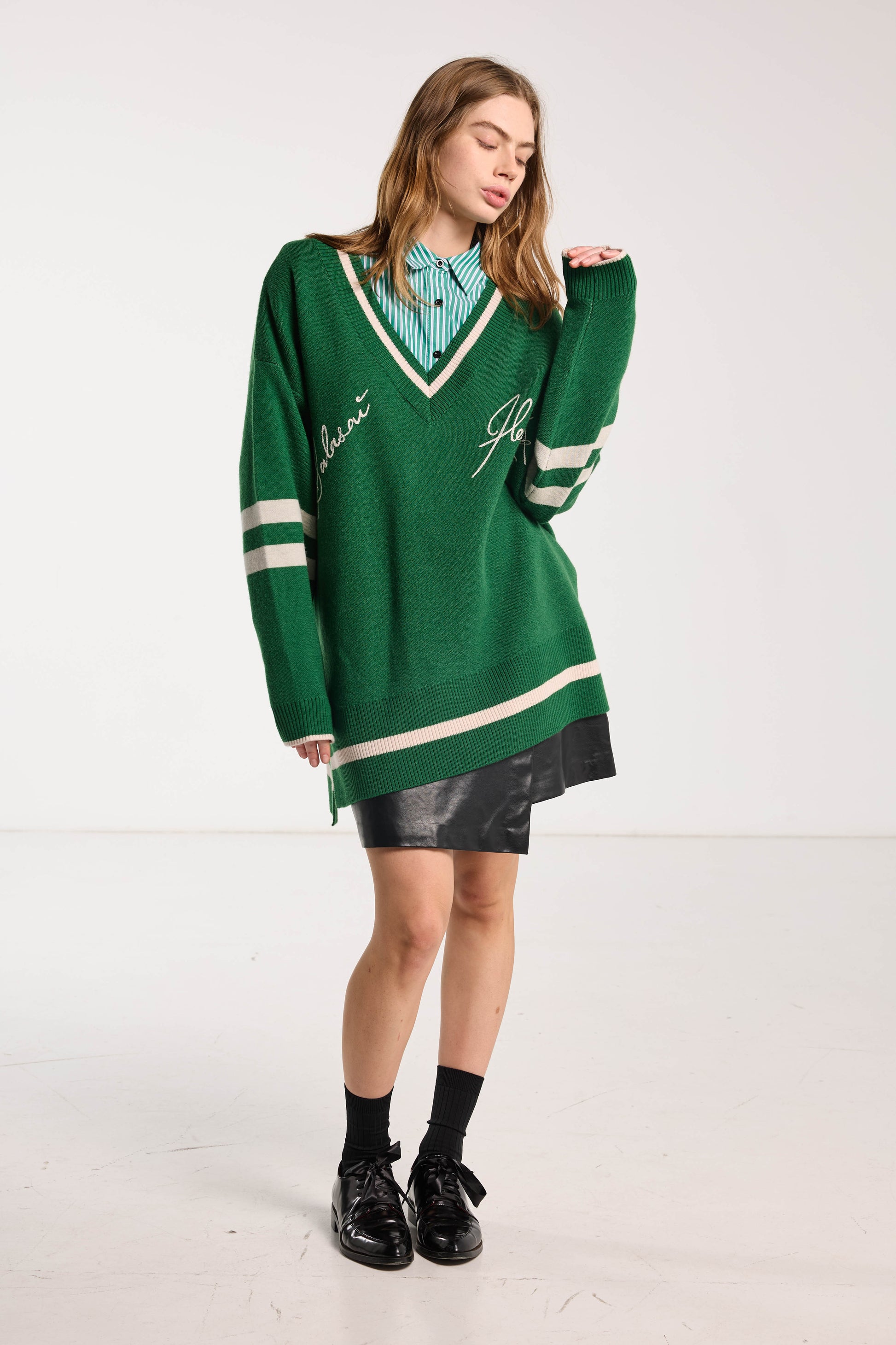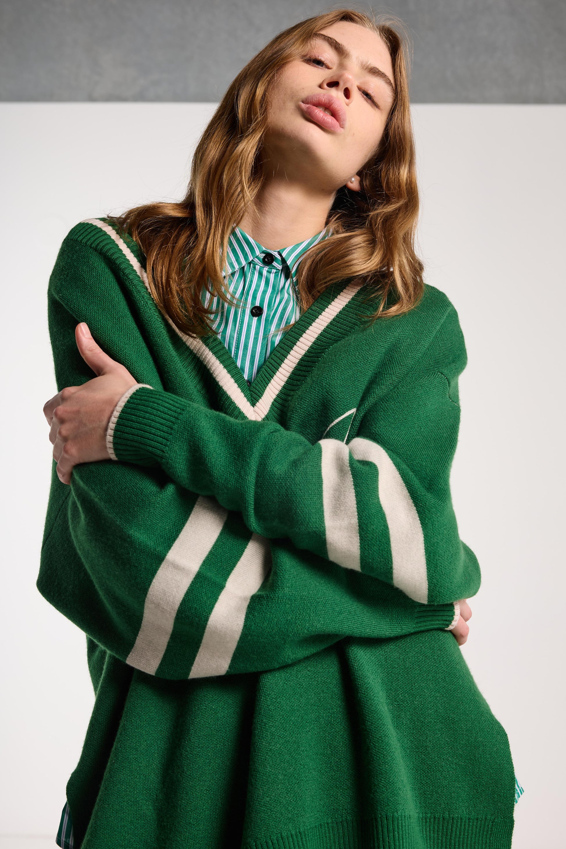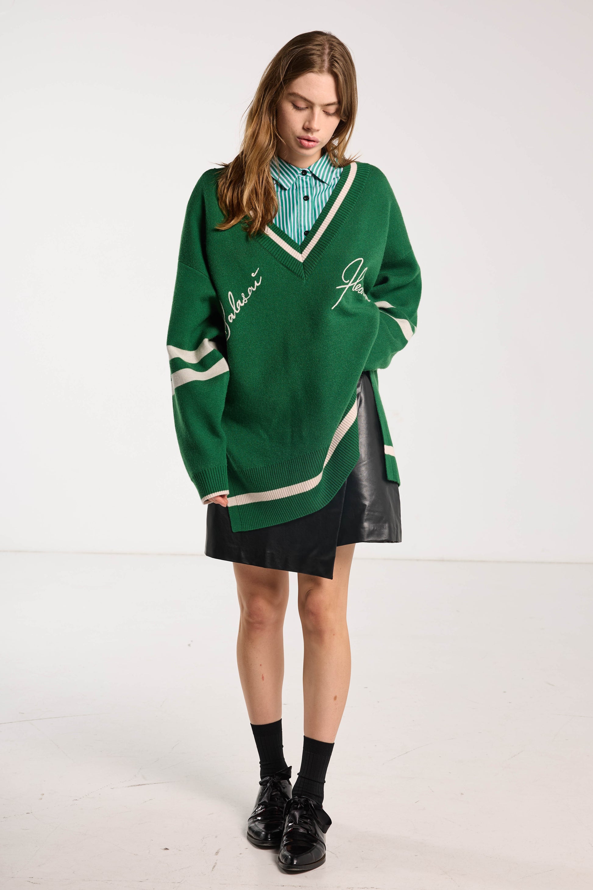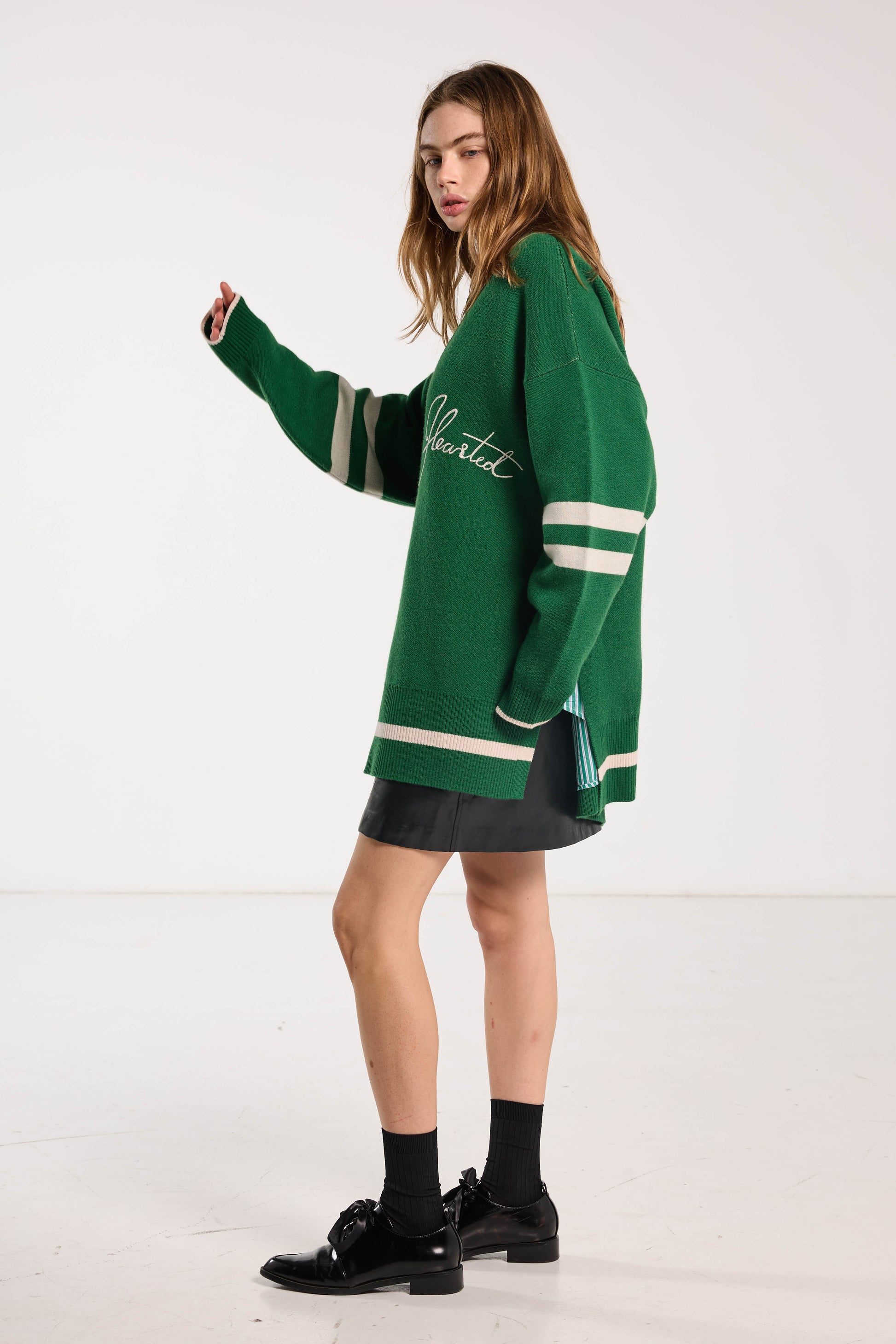 Elevate your cold-weather wardrobe with our Hearted Jumper. Its oversized cable knit design, v-neck, and slouchy fit make it perfect for layering. Made with high-quality merino wool, the jumper also features intricate embroidery detailing and a vibrant Grass Green hue. Stay warm and stylish all season long!