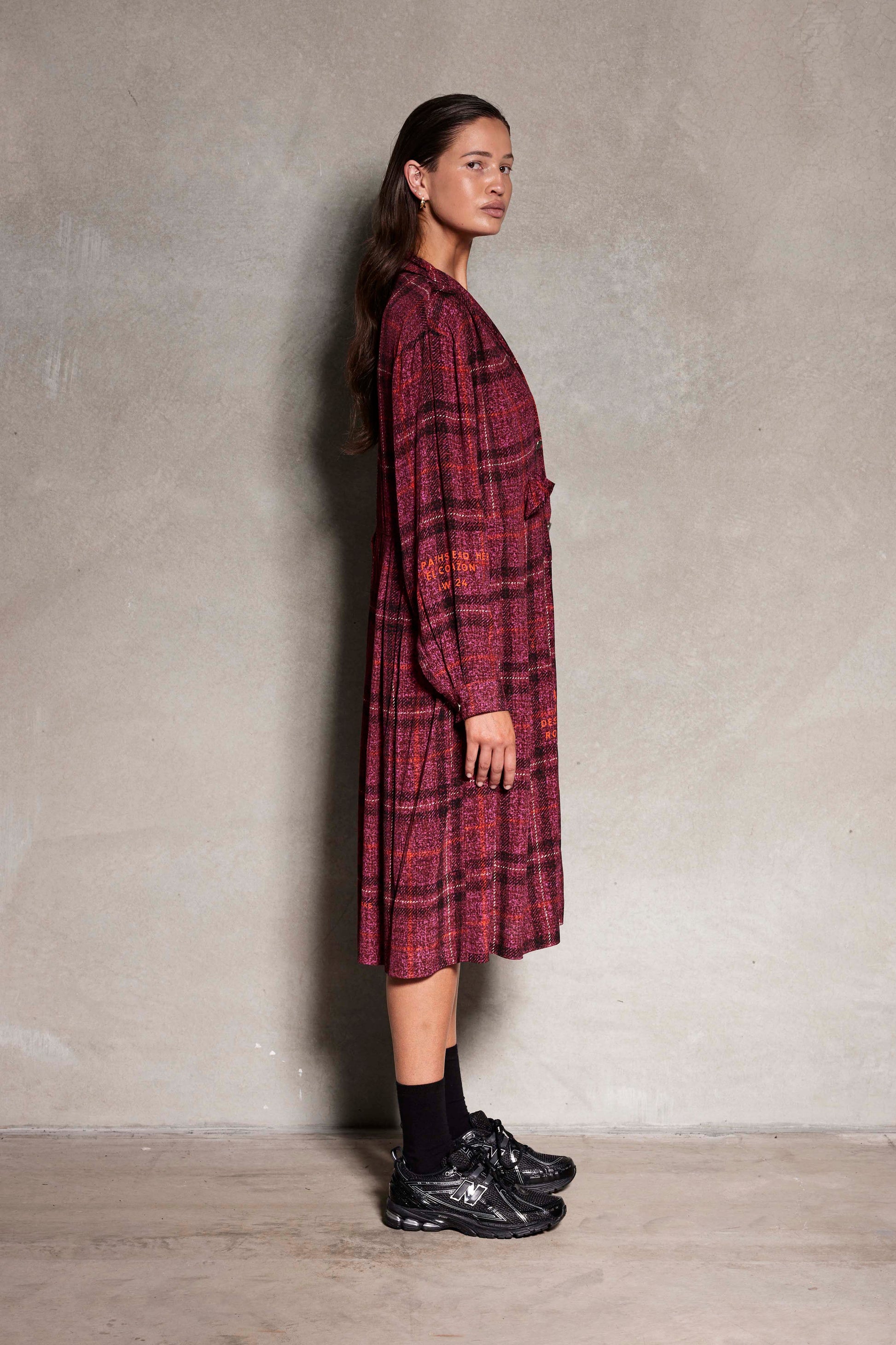 The Mid length, long sleeve dress in pink check is a versatile dress perfect for work, weekends, and everything in between. The classic check pattern is timeless and chic, while the mid length cut is flattering on all body types. The long sleeves and oversize fit provide extra warmth and coverage, making it perfect for cooler weather.
