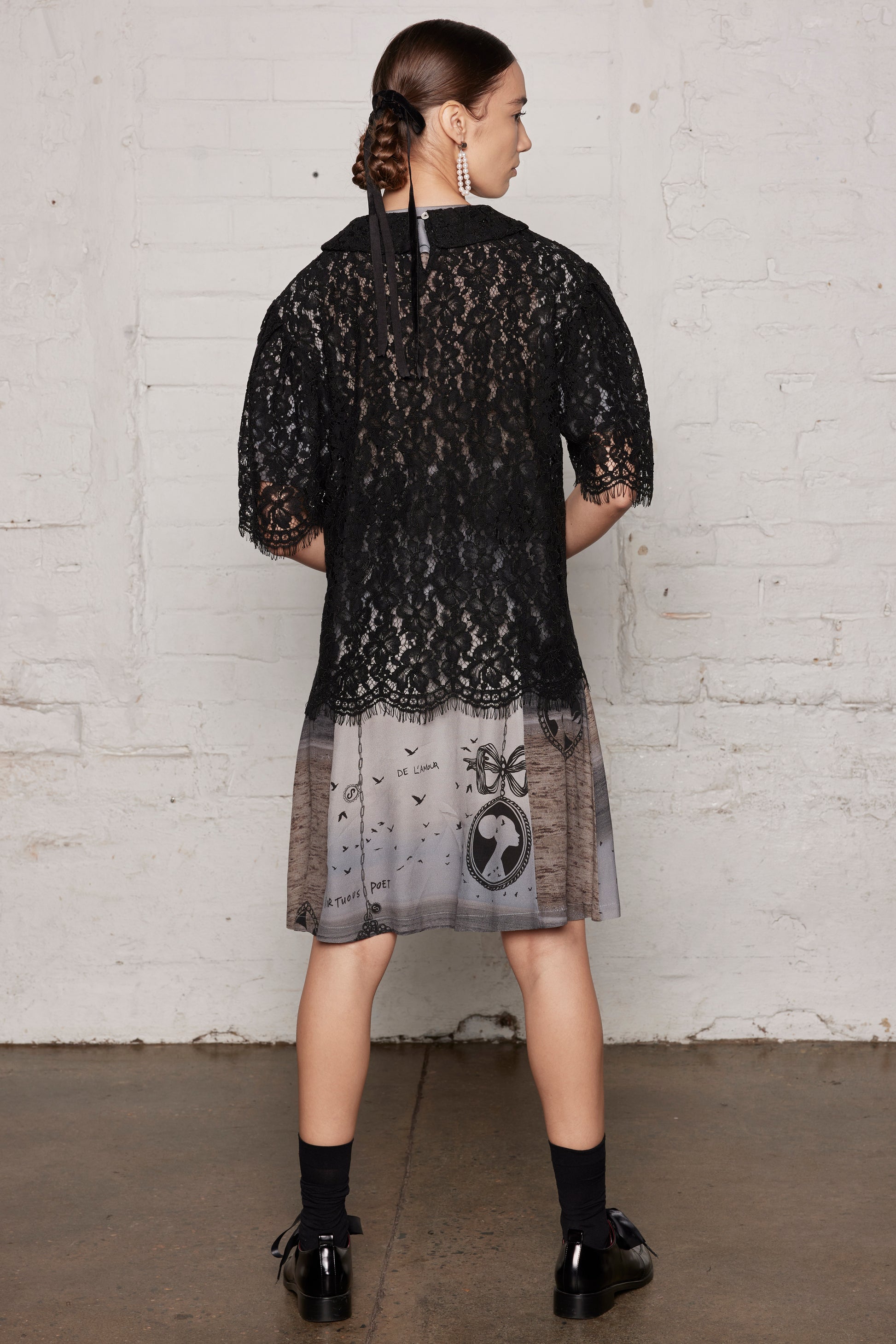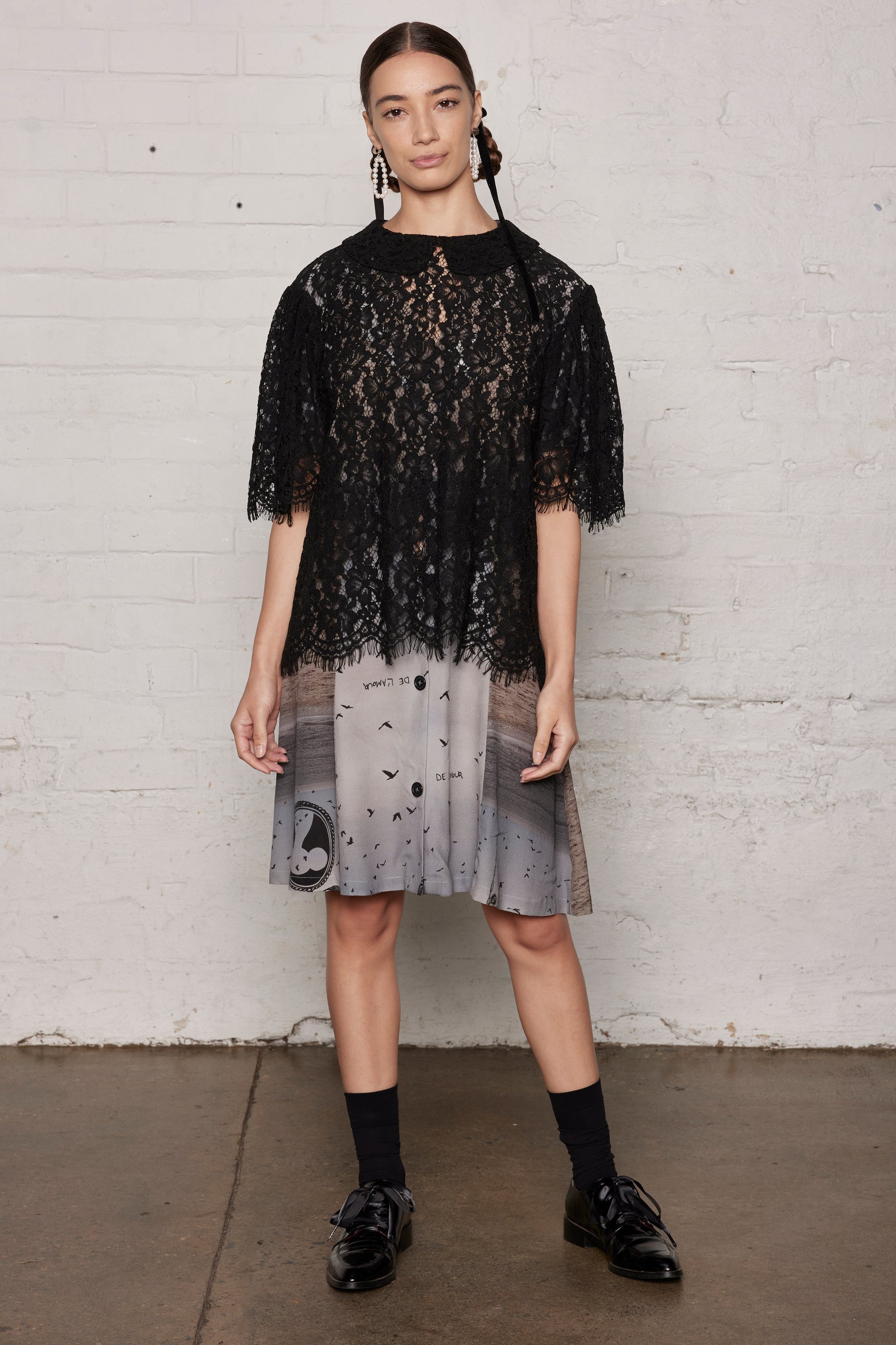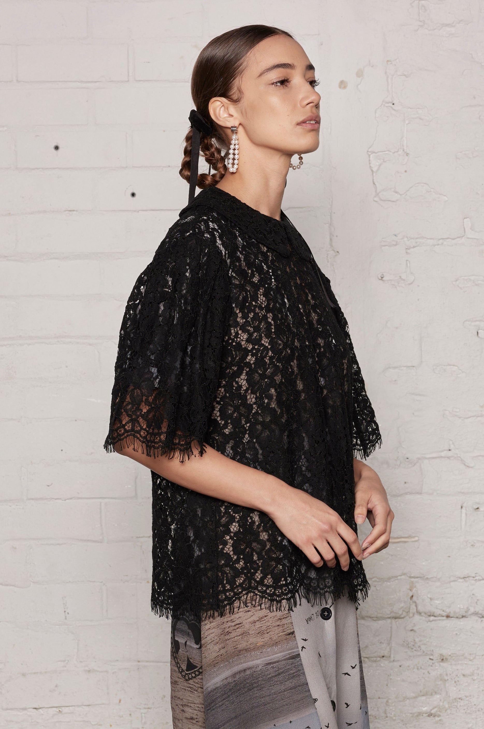 The Ornamental T is a contemporary take on the women's collared Blouse. The boxy oversized silhouette with the sheer lace make for a design that is both robust and relaxed, an essential staple for everyone.