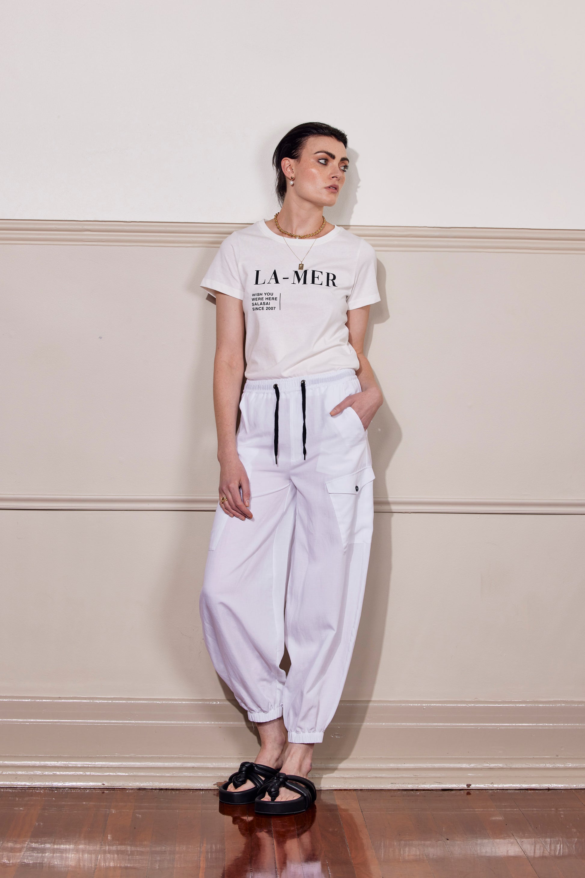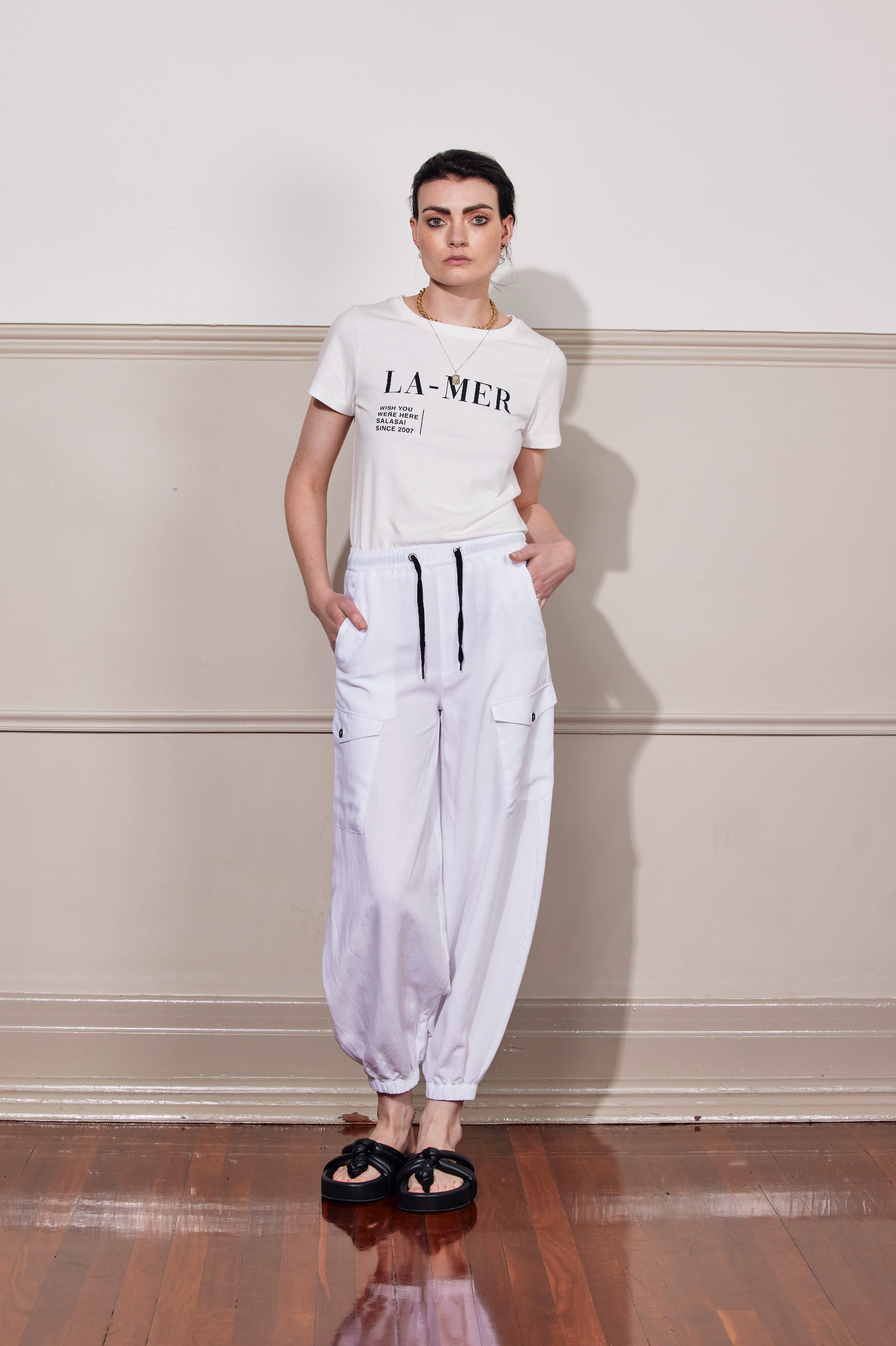 Details include cargo pockets on legs and a full wide leg loose fitting feel with elasticated hems. This style can be worn not only casual with sandles or kicks but also dressed up with heels or boots.