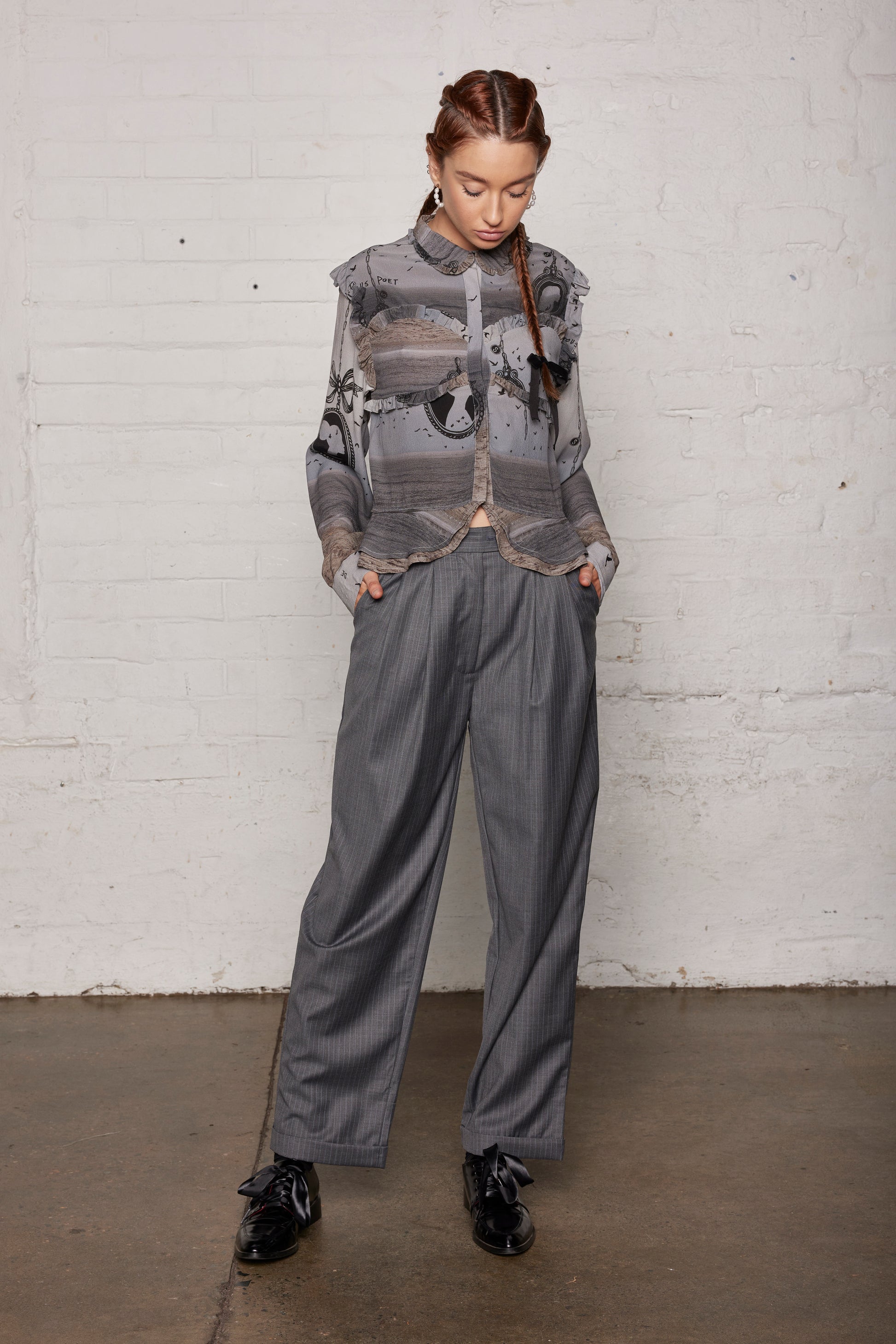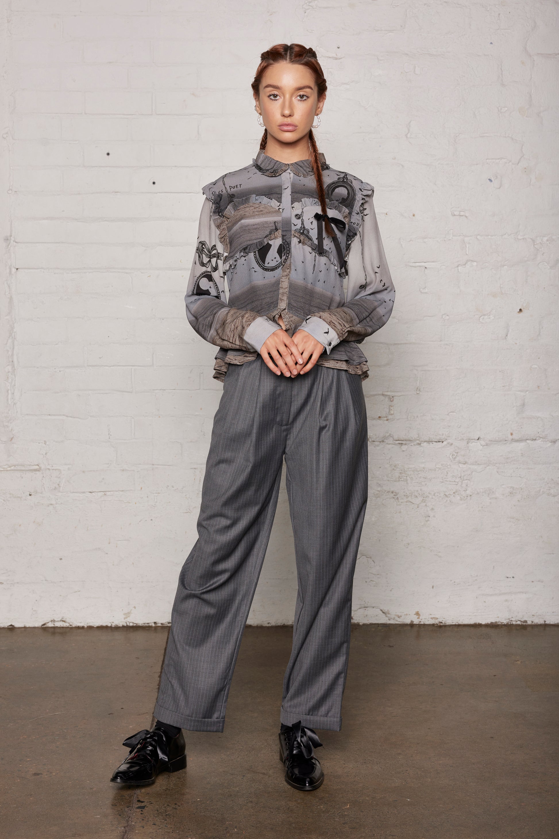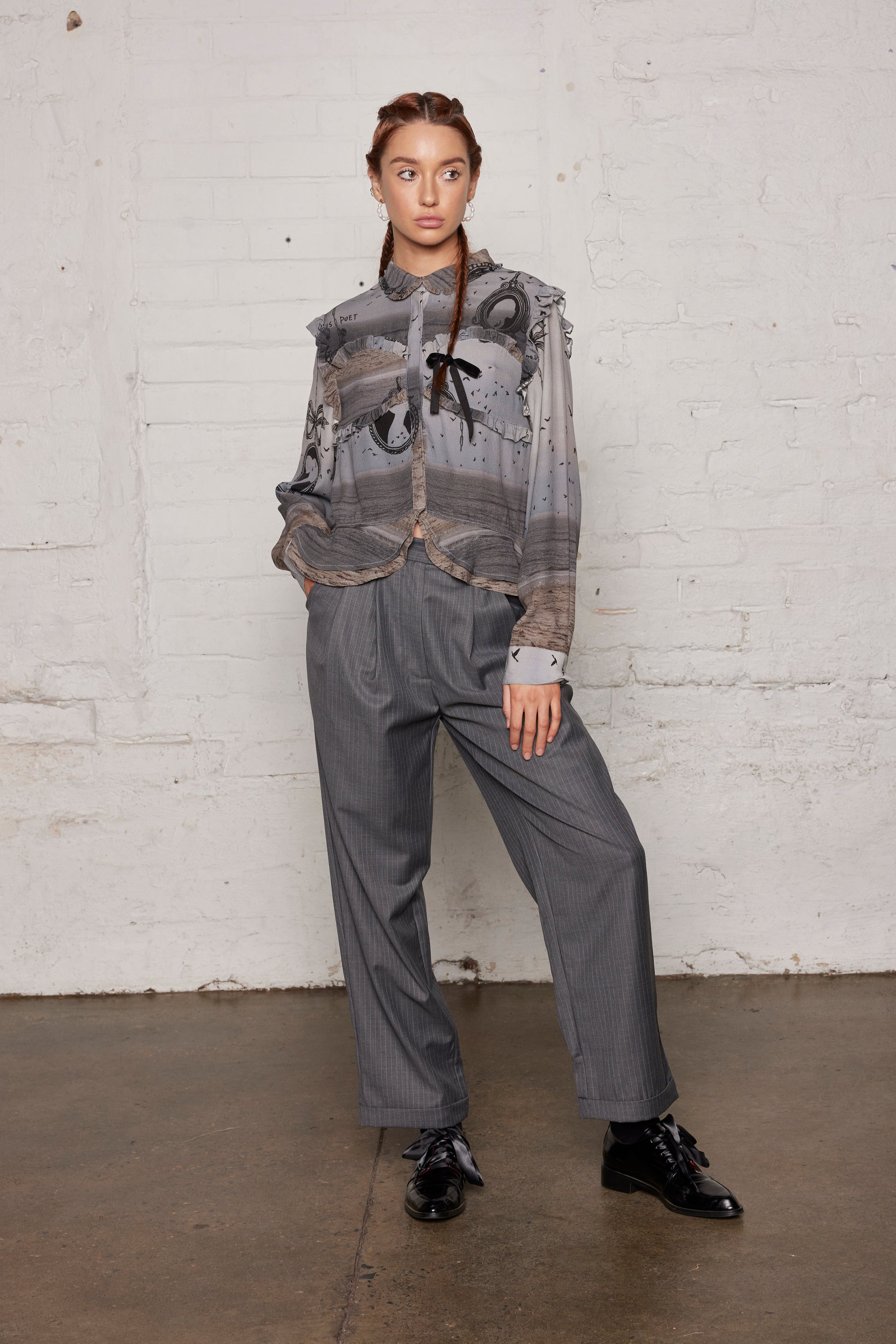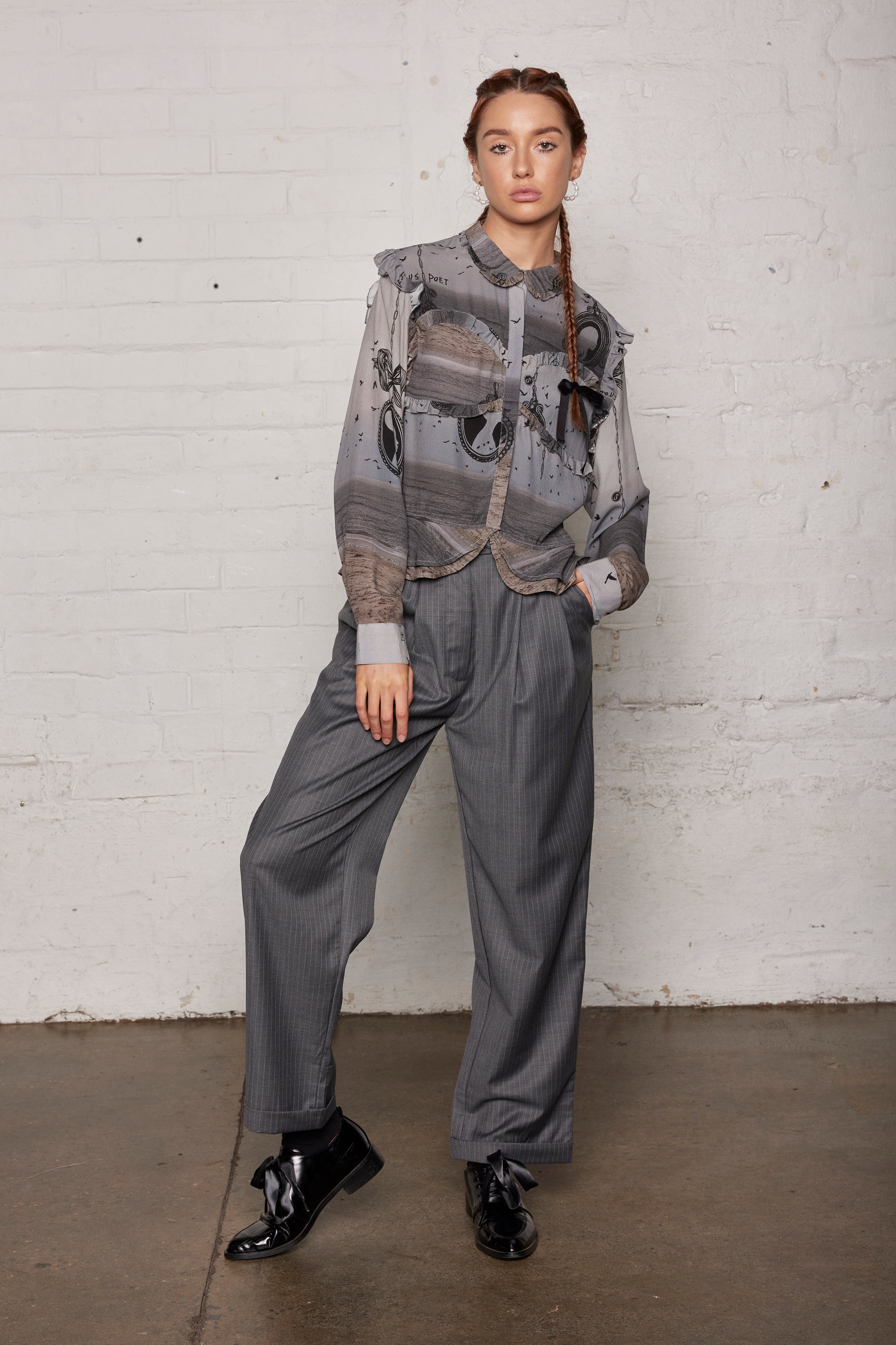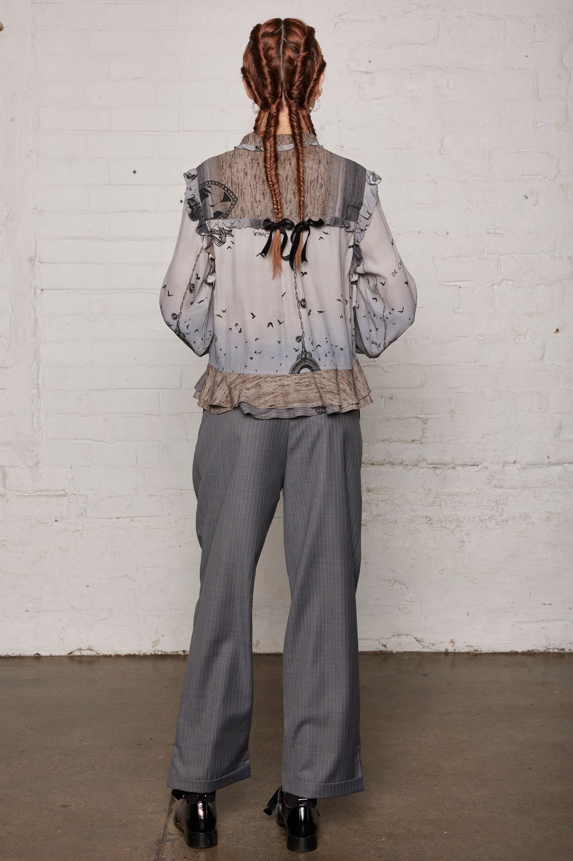 This blouse features a dainty ruffled collar with beautifully stitched ruffled hem at armhole and a charming sweetheart ruffled bodice detailing. It has a billowy sleeves and a hidden button up placket. The waist finishes in a stunning peplum layered hem.