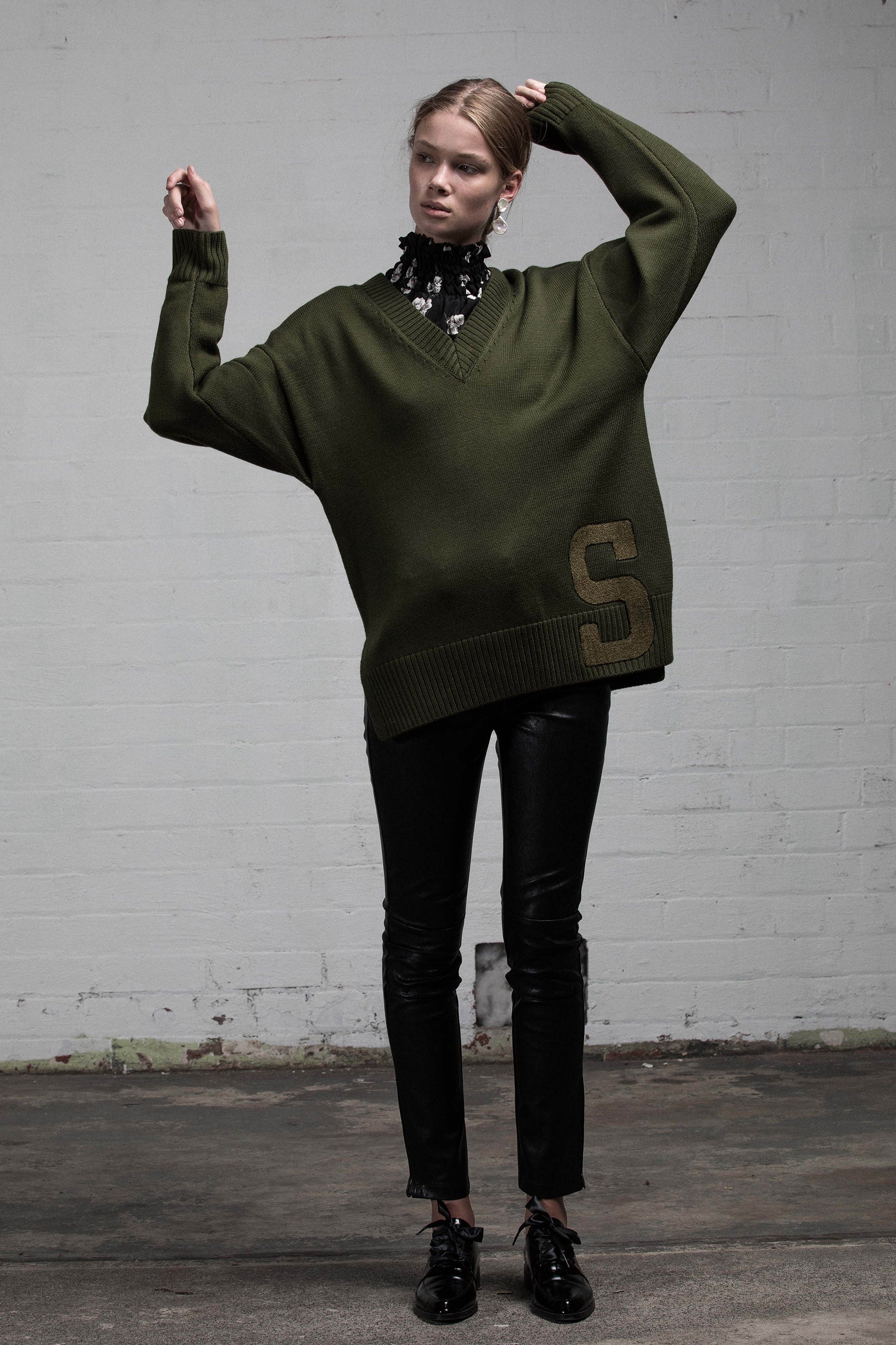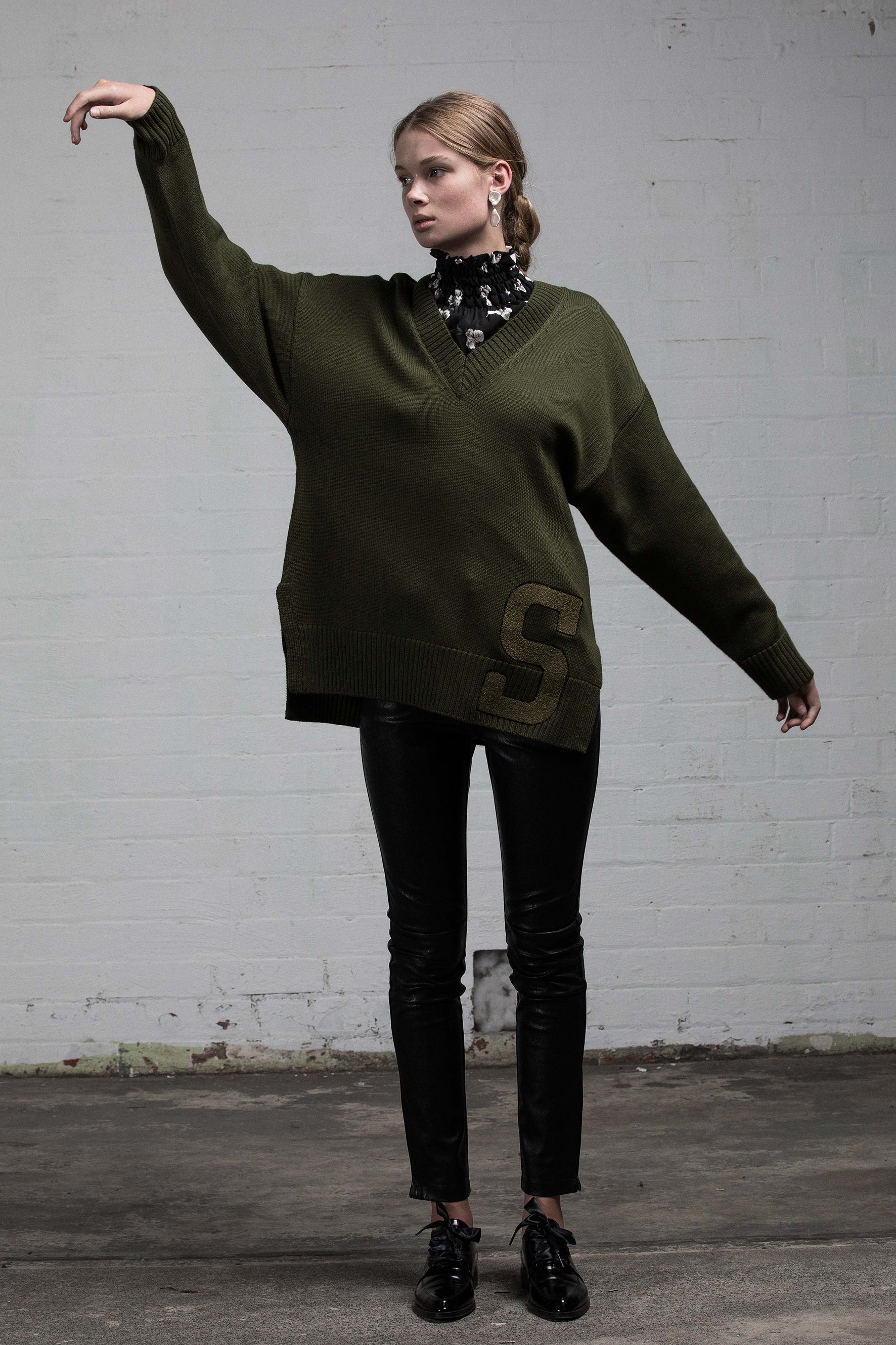 Features include a patched 'S' on the bottom right of the jumper. V neck front neckline, sleeves and hem and side splits creating a splayed fit designed to be worn over anything loose or fitted.