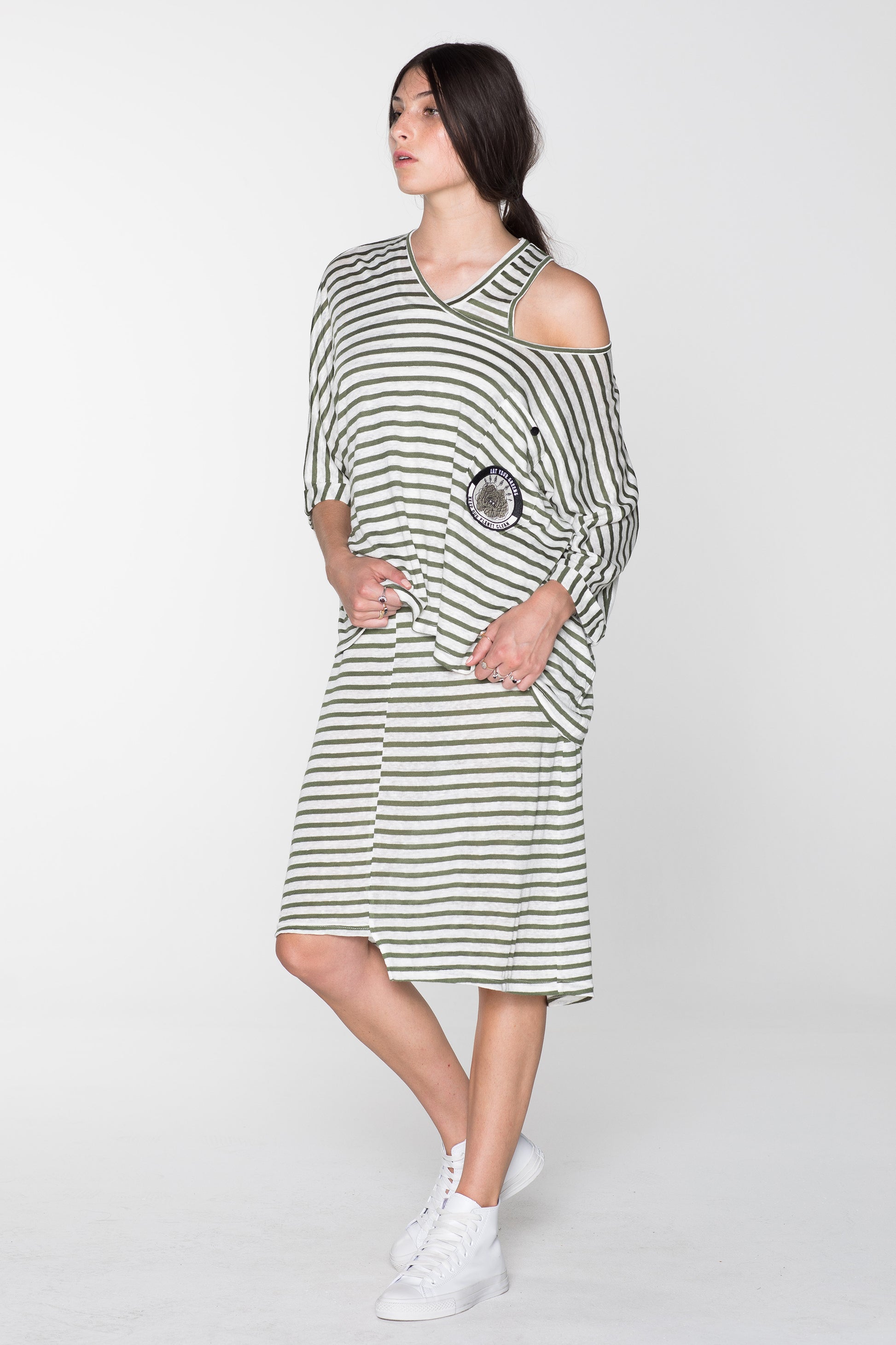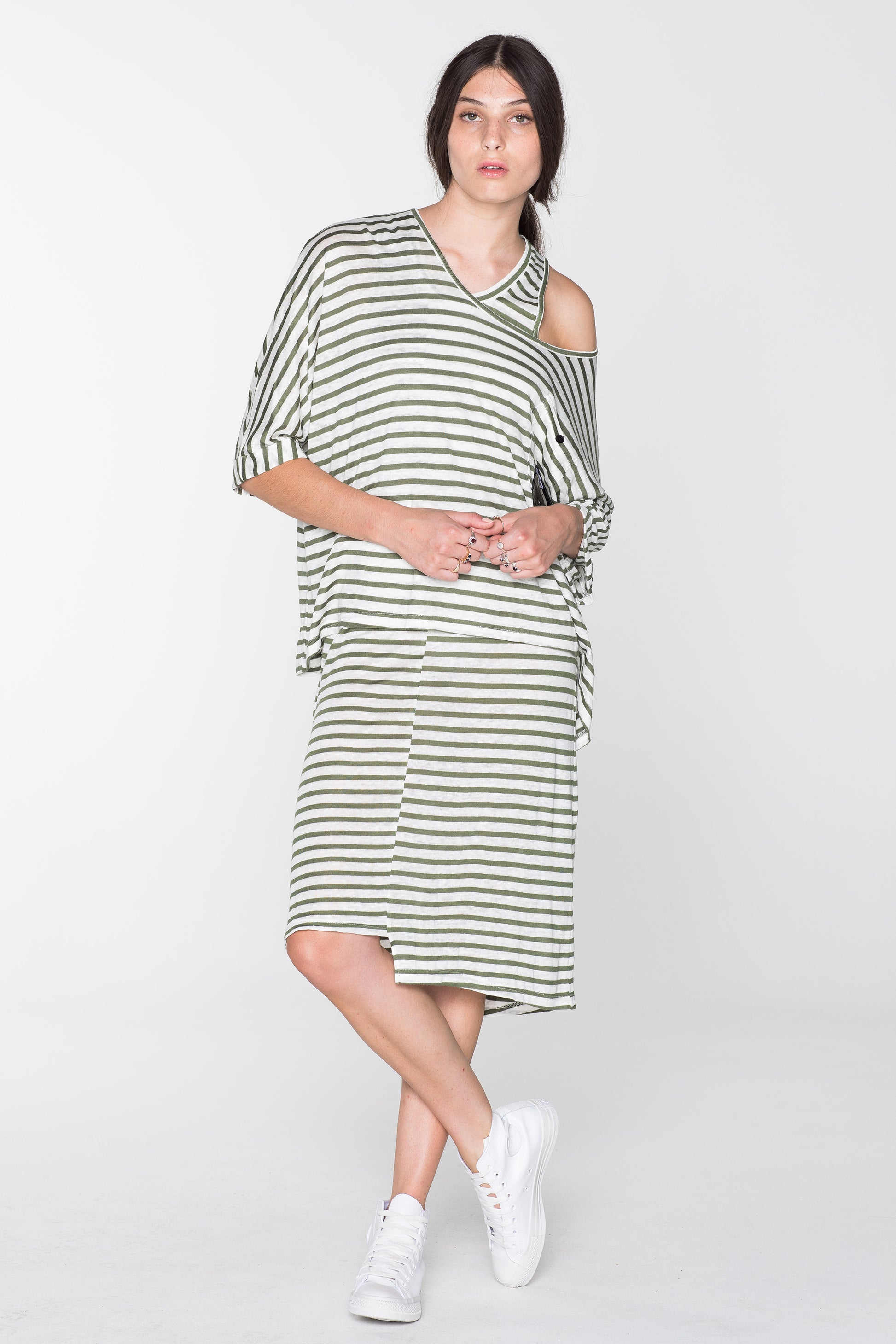 The Survival tee in stripe is a Salasai wardrobe staple. The oversized cropped silhouette is beautifully balanced in the light weight linen knit. The tee features a boat shaped neckline and the SS19 'SALASAI ADVOCATE' patch on the chest.