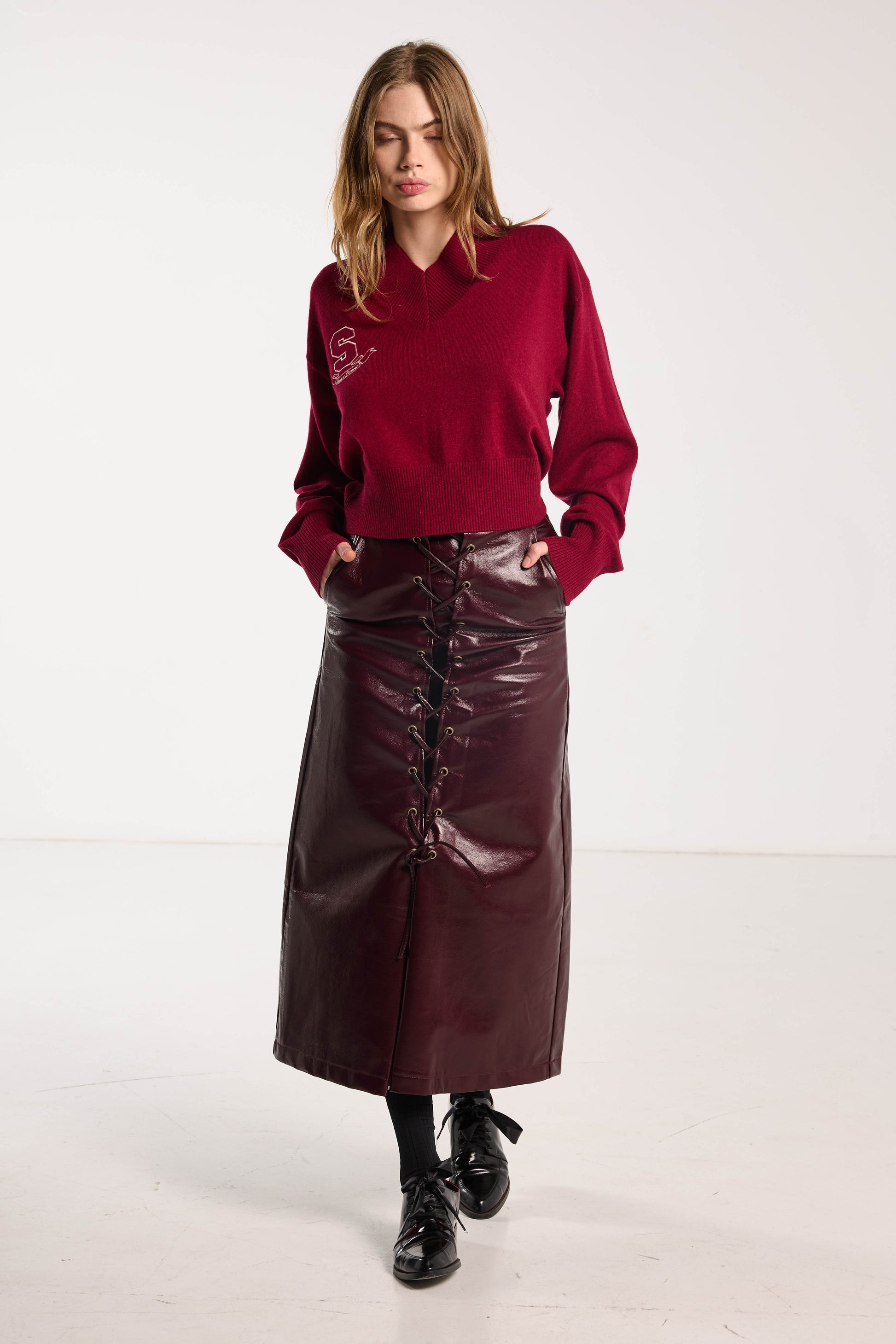 Introducing the Sweetheart Raspberry. This luxurious cashmere jumper features a v-neck and thicker ribbed neckline, waist, and cuffs. With its slouchy fit, it's perfect for layering and adding a touch of warmth and style to your wardrobe. Stay cozy and chic with this must-have piece.