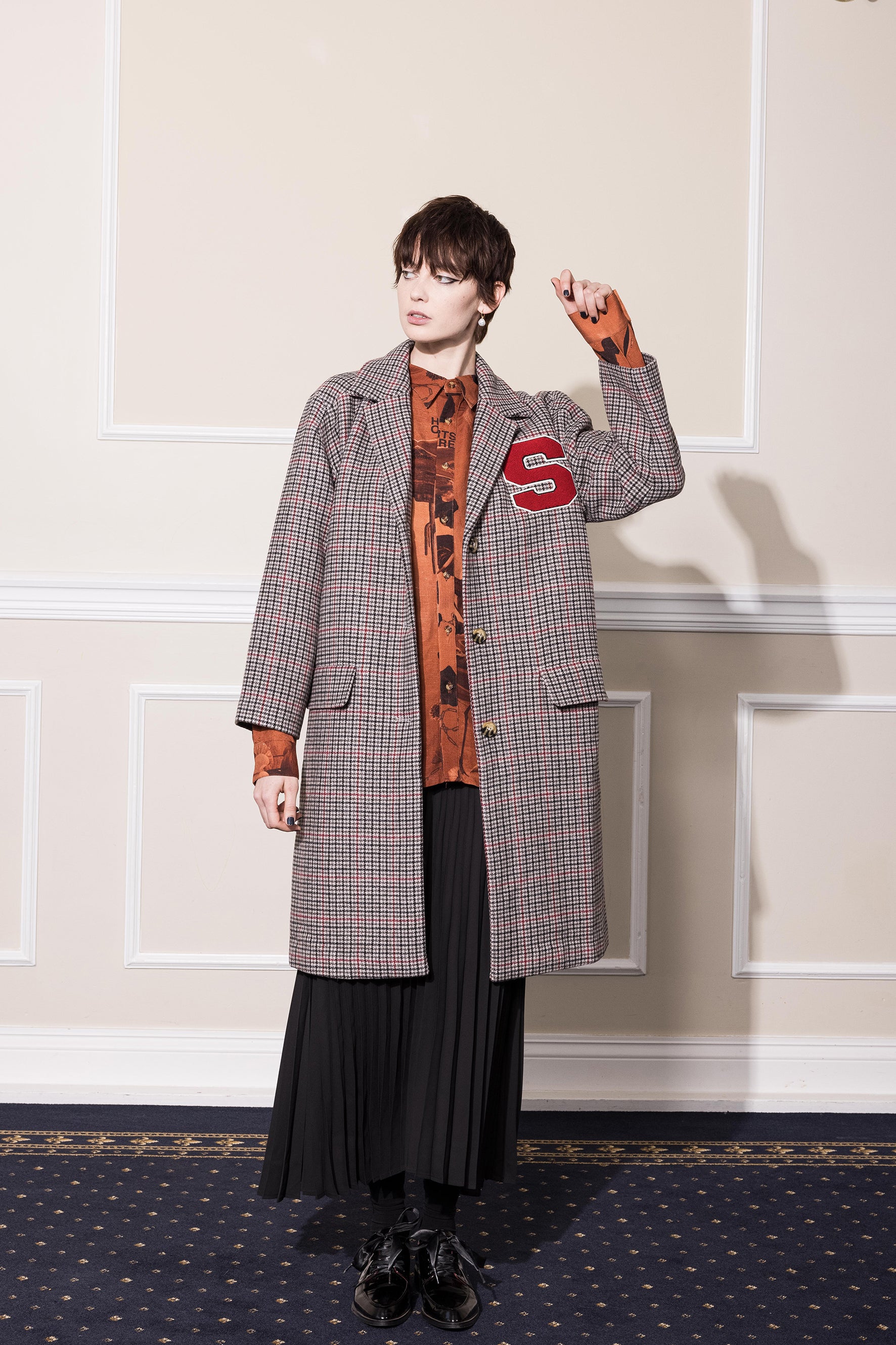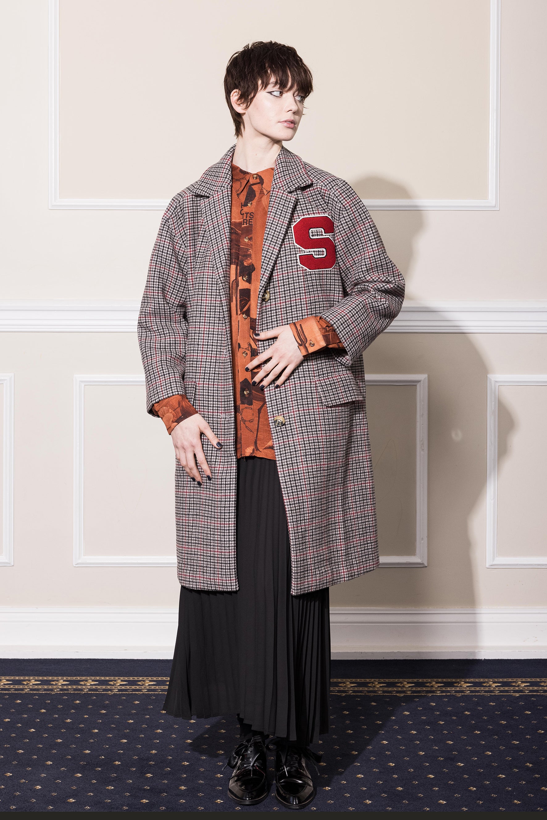 Note this Jacket is reminiscent of a lady whose jacket is slightly too big for her, this coat has long sleeves front buttons and a back vent with an oversized red collegiate typography "S" on the chest.