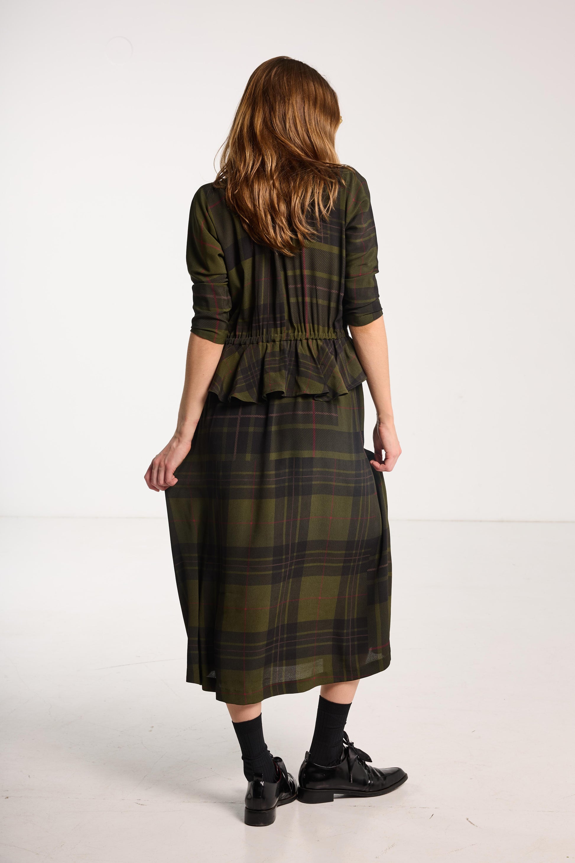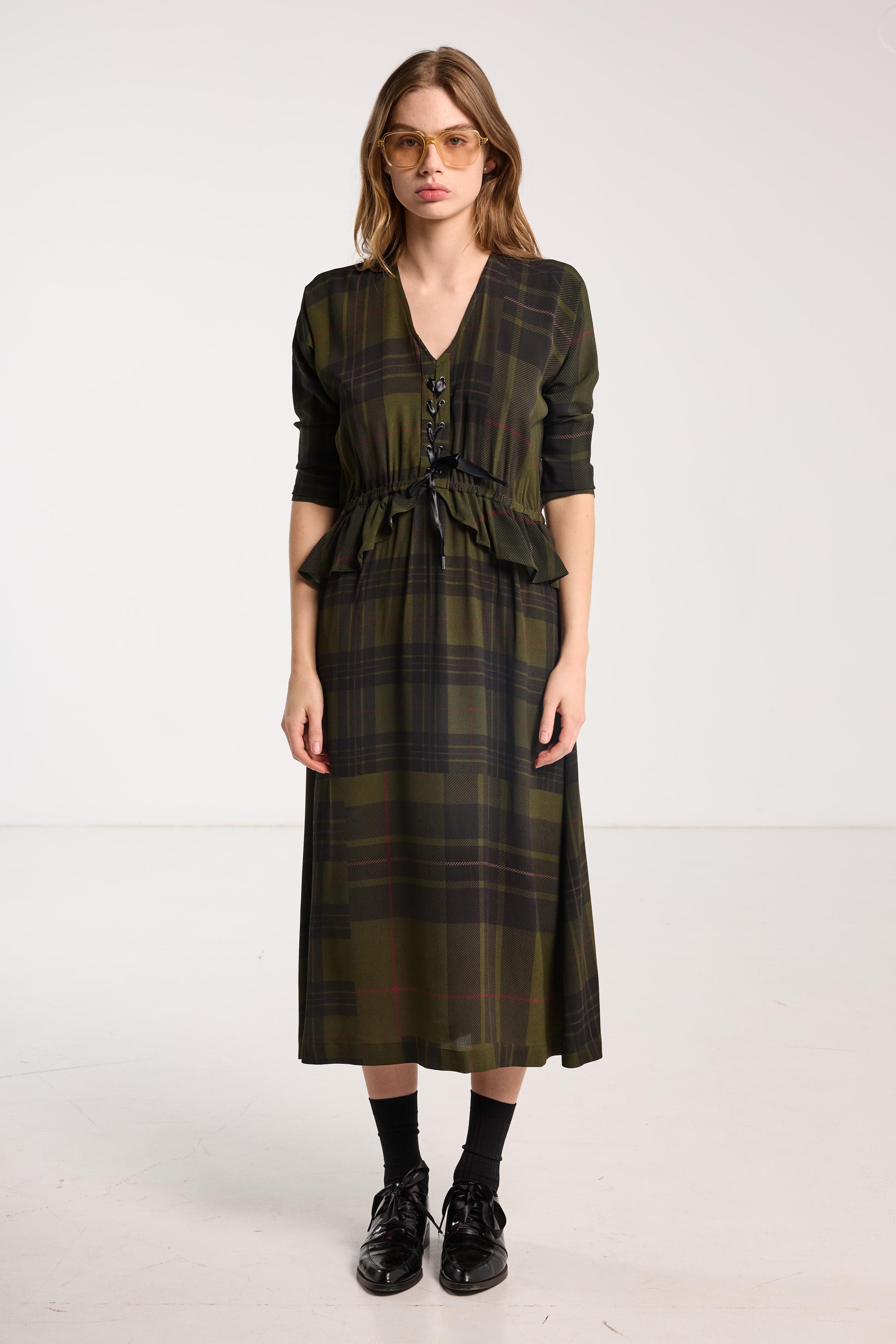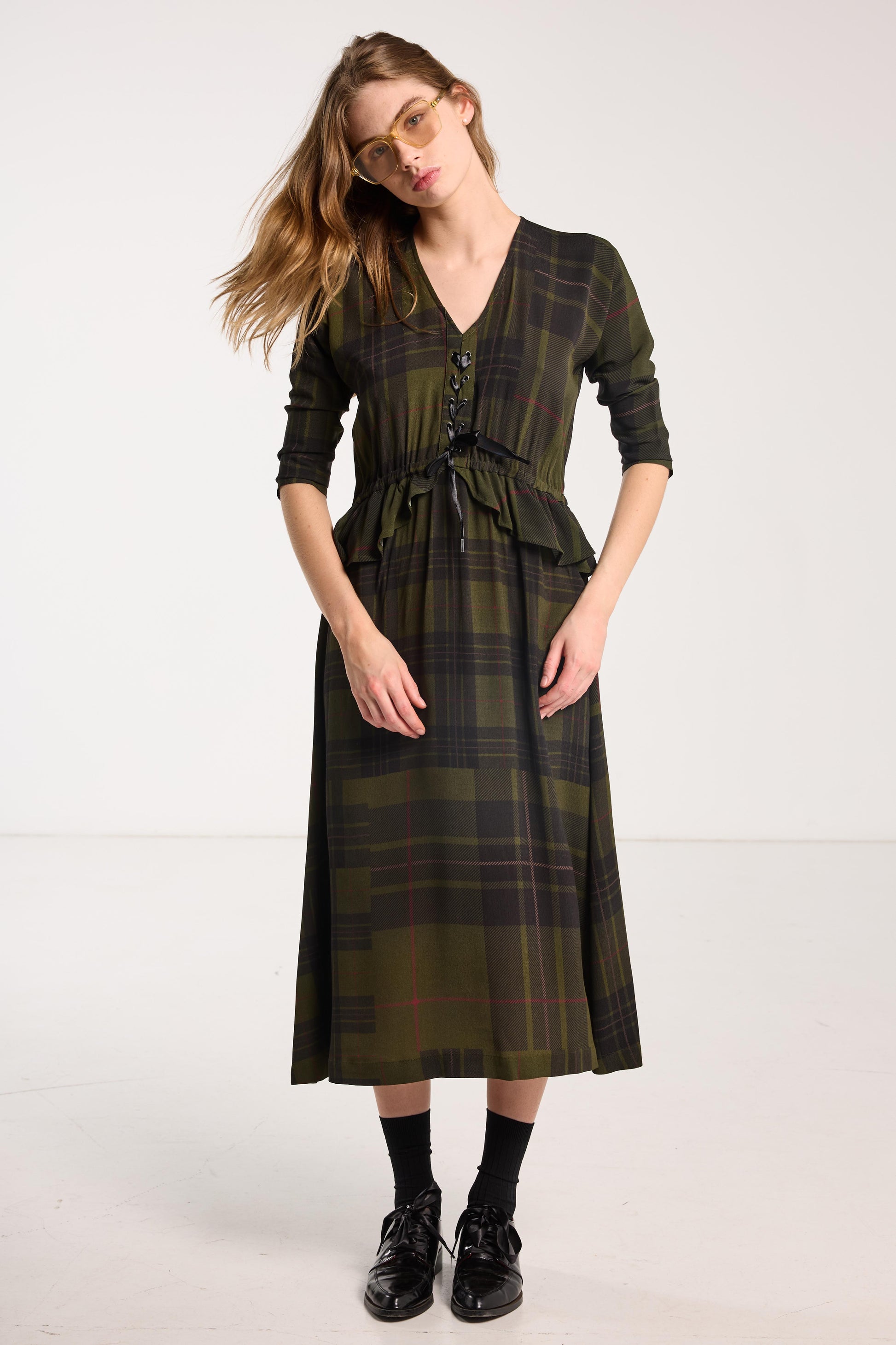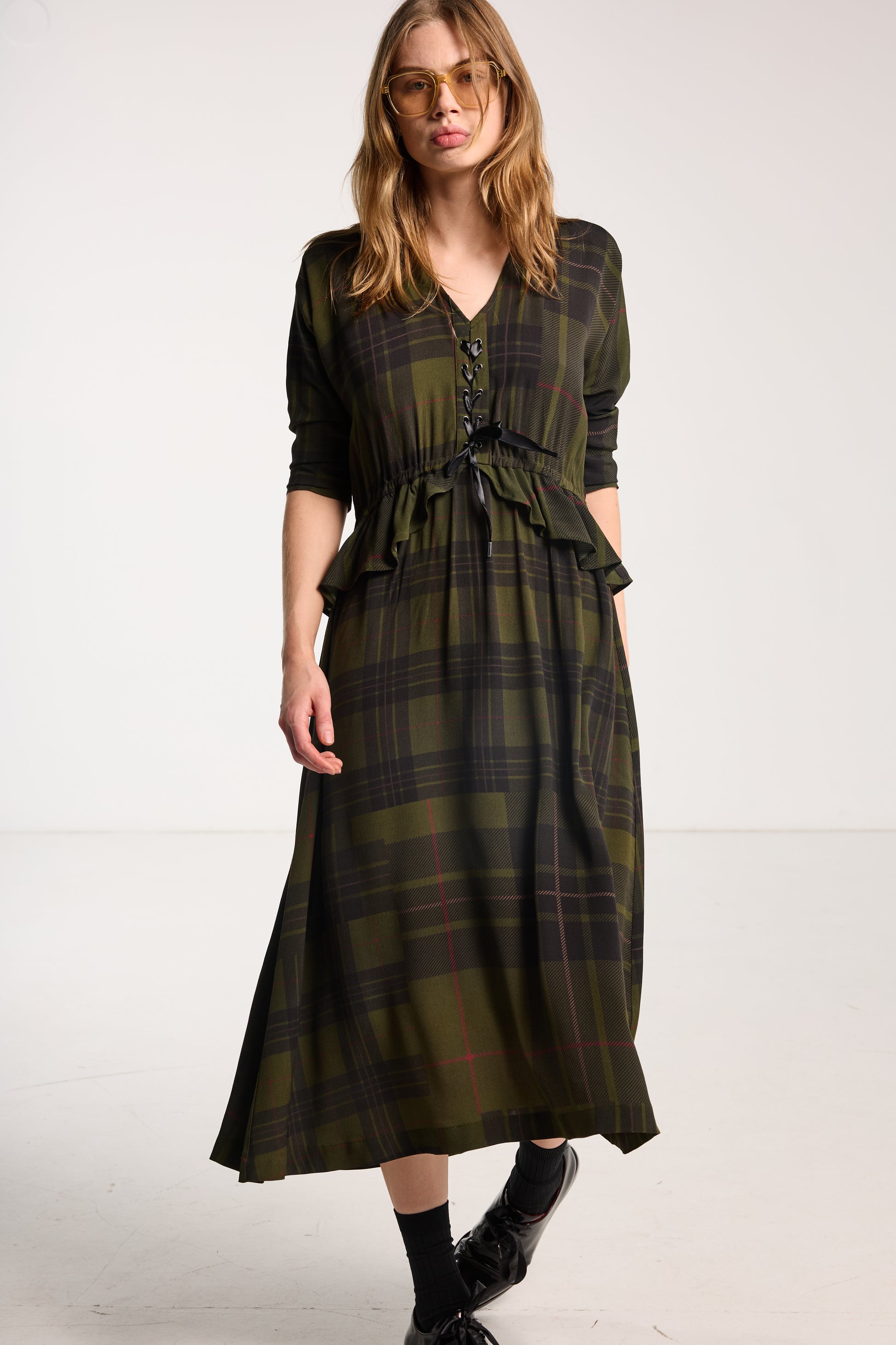 Embrace the romantic vibes with our Valentine Dress, featuring a charming Forest Green Check print. The 3/4 sleeve length and v neck add a touch of elegance, while the lace up detail and waist frill bring a playful and flirty touch. Comfortable and stylish, perfect for any occasion!