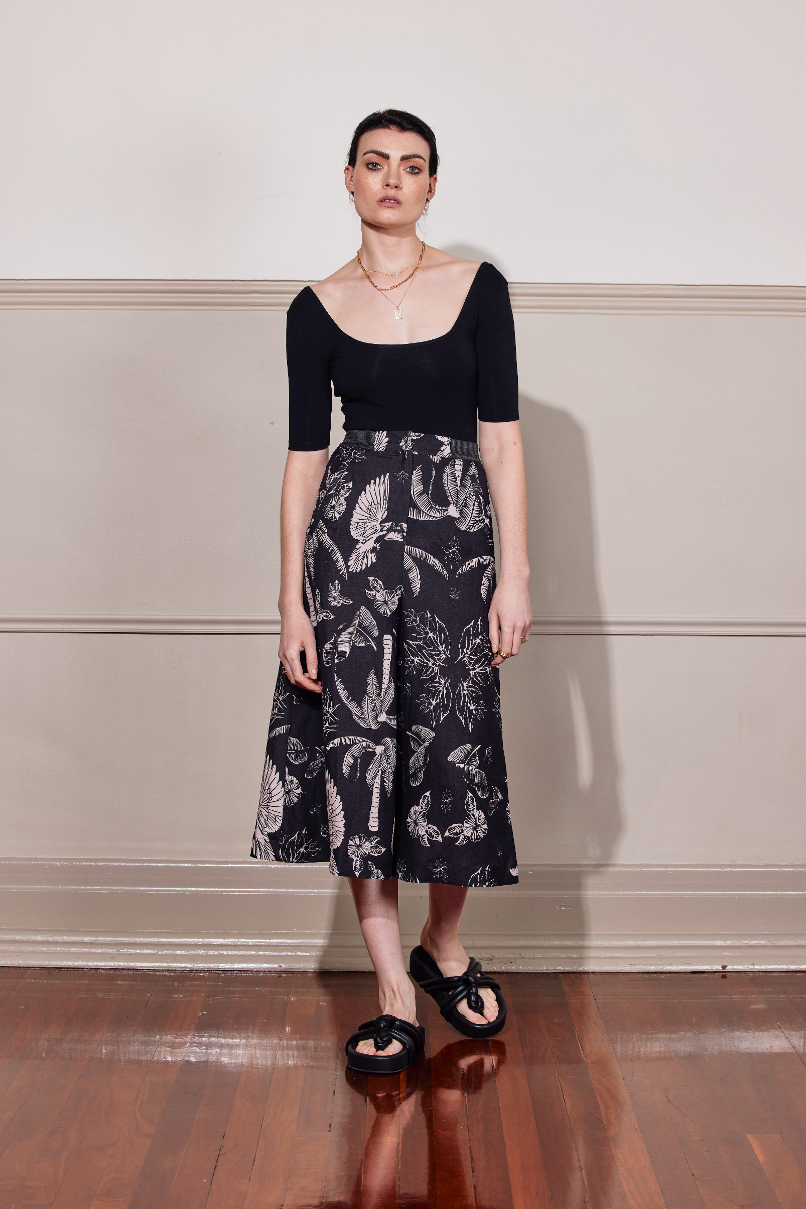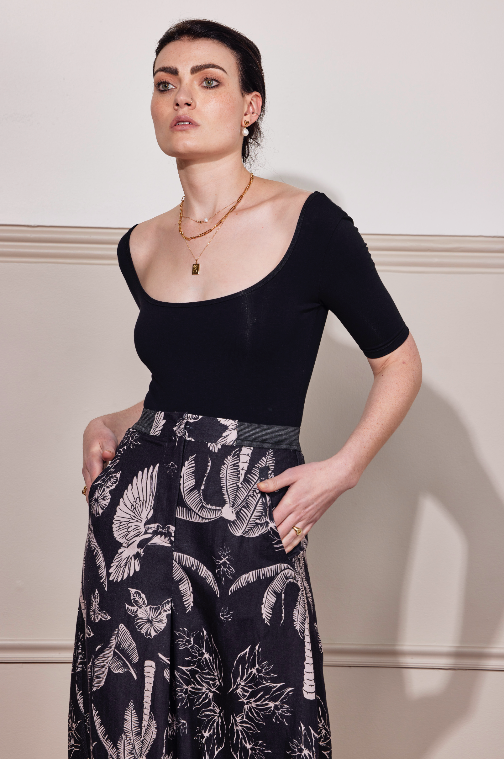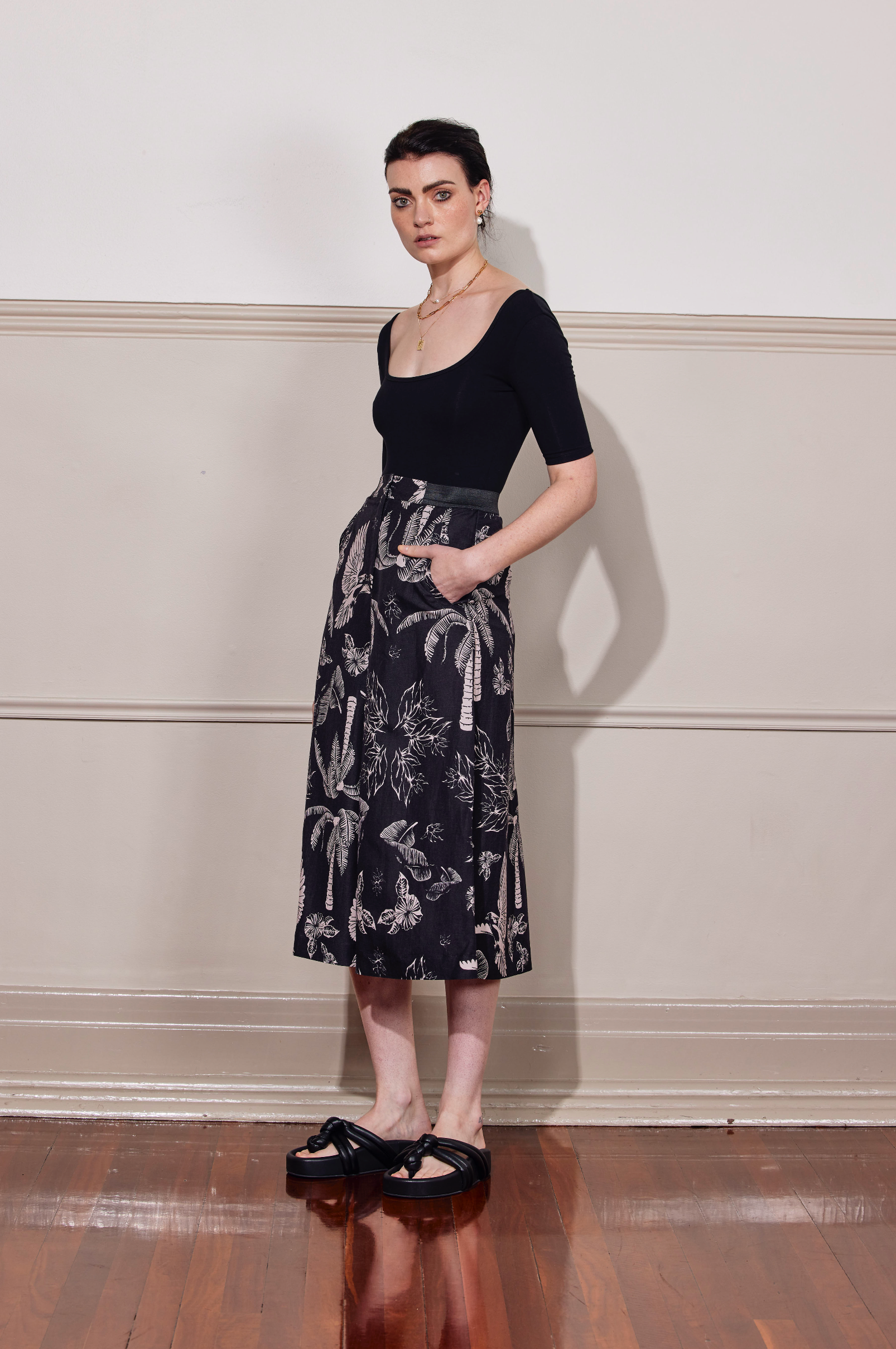 The Wild Tropics Skirt is a beautifully crafted statement skirt in classic black and ivory.