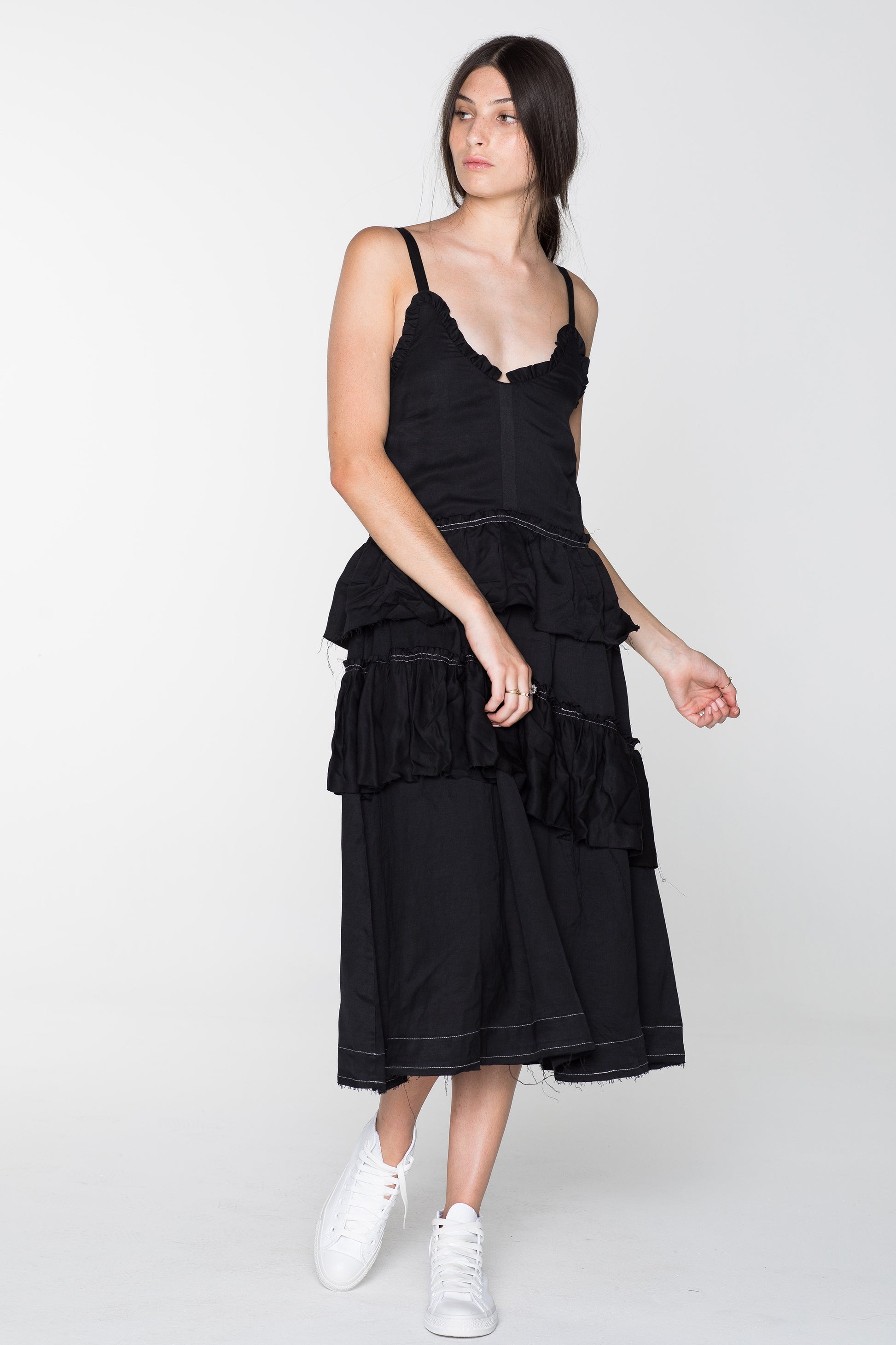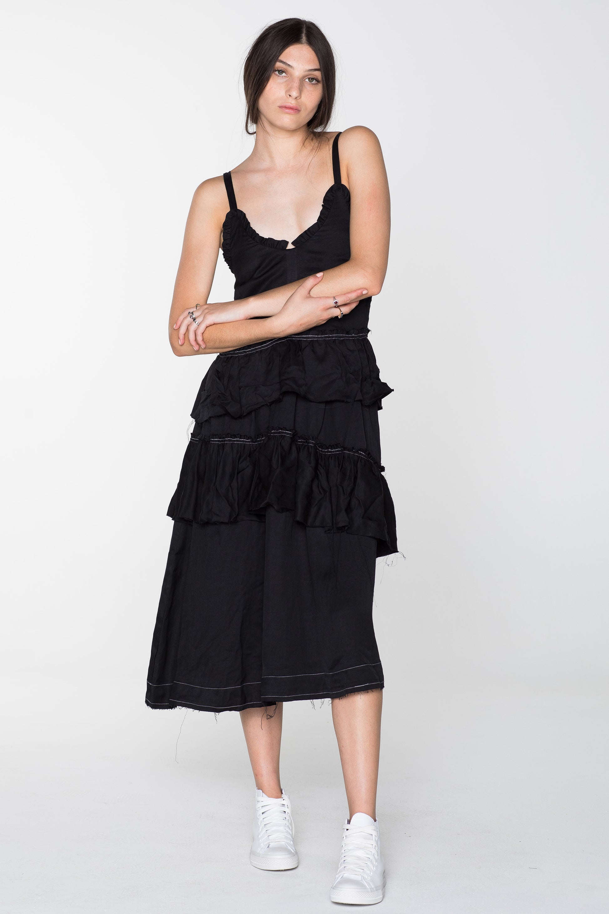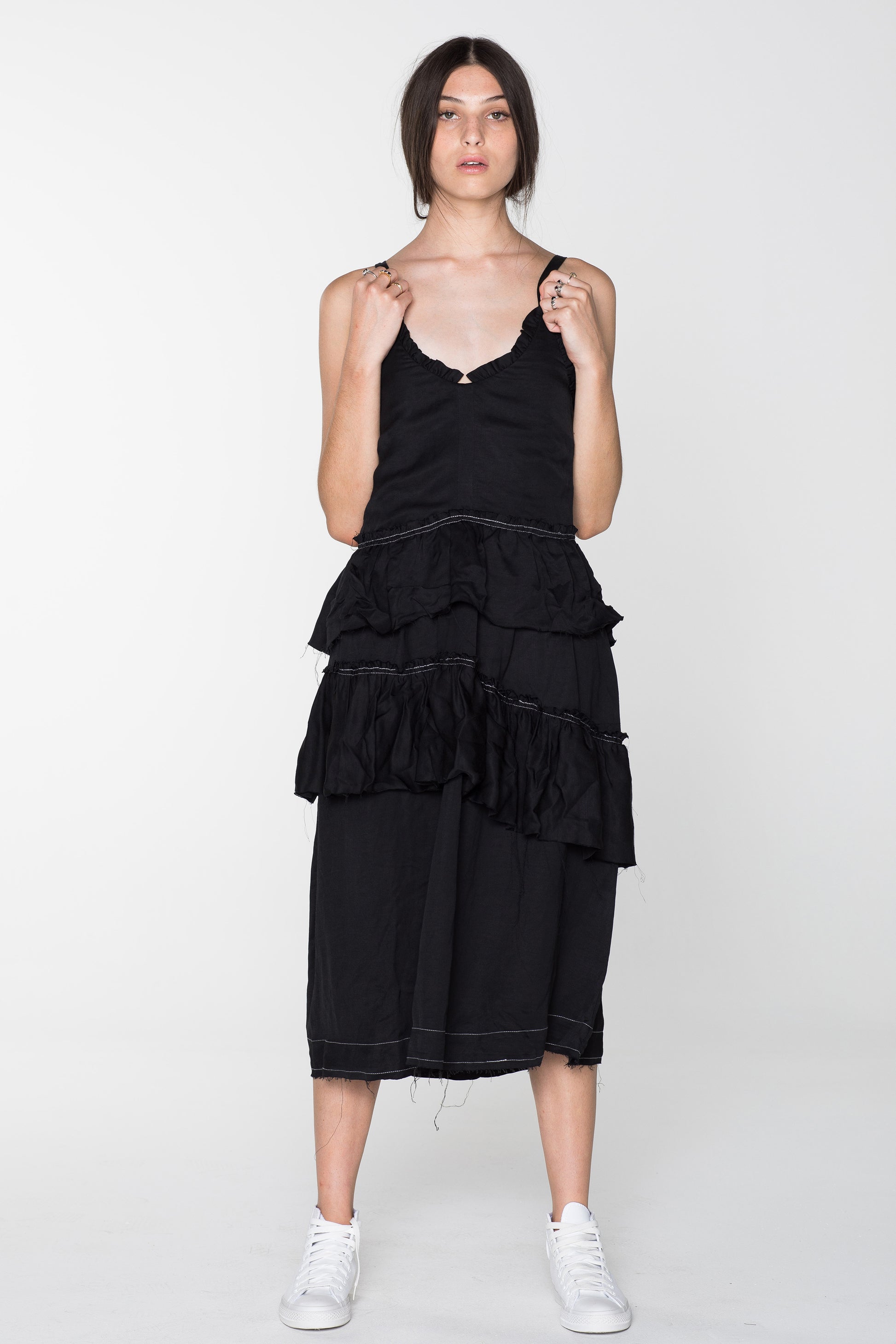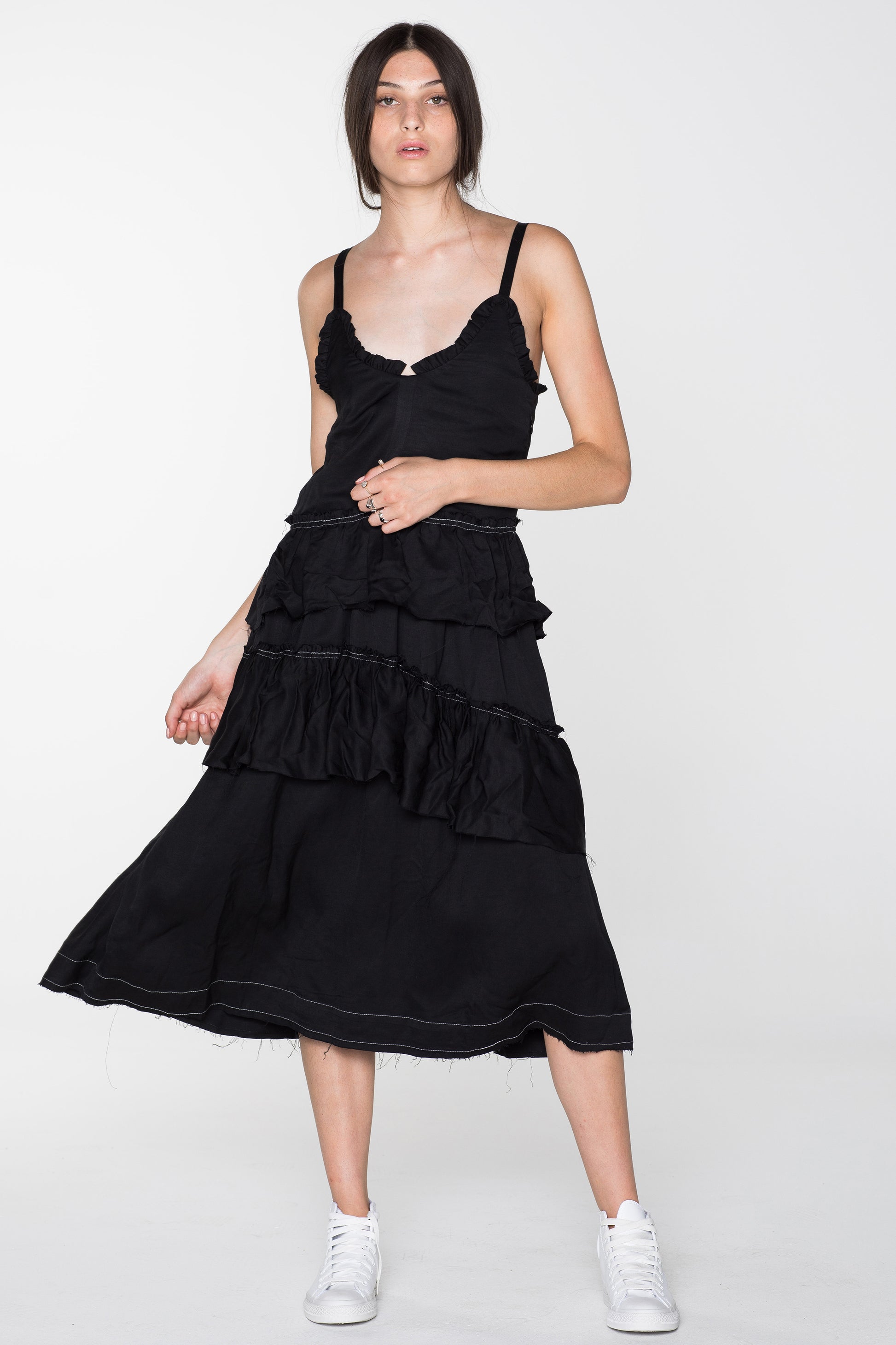The Wildlife dress is the Salasai statement dress for Spring Summer 2019. Beautiful soft ruffles detail the neck line while raw edged frills add dimension and intrigue to the this elevated classic black dress. The waist line and skirt frill are appliquéd on with white topstitching giving a strong contrasted finish.